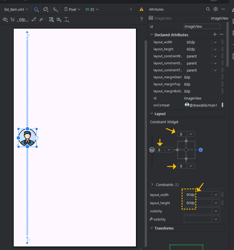 그리고 삽입한 man 이미지의 가로 폭(layout_width)과 세로 높이(layout_height)를 60dp로 설정해 주세요.