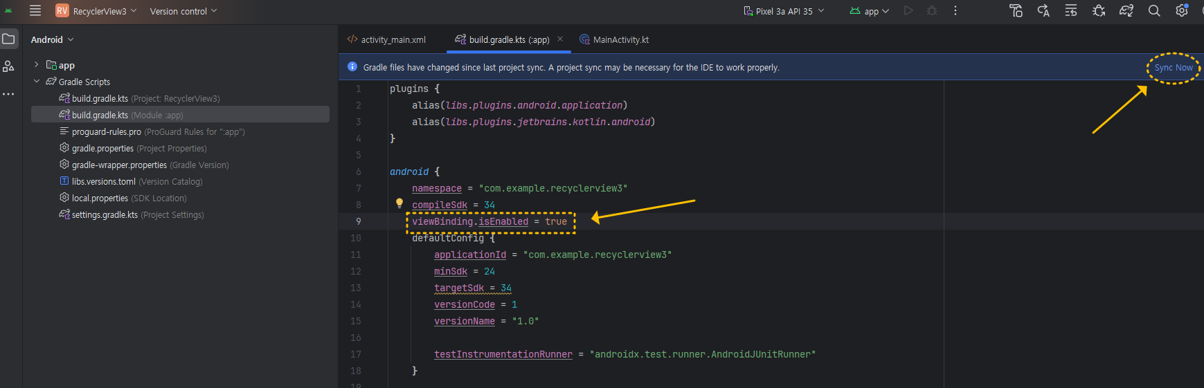 프로젝트 탐색창에서 "Gradle Scripts" 항목을 펼쳐보면 "build.gradle.kts (Module :app)" 이 보이고 더블클릭해 열어서 아래 이미지처럼 viewBinding.isEnabled = true를 android { ... } 사이에 넣어주세요. 그리고 변경사항이 적용될 수 있도록 "Sync Now"를 클릭해 주세요.