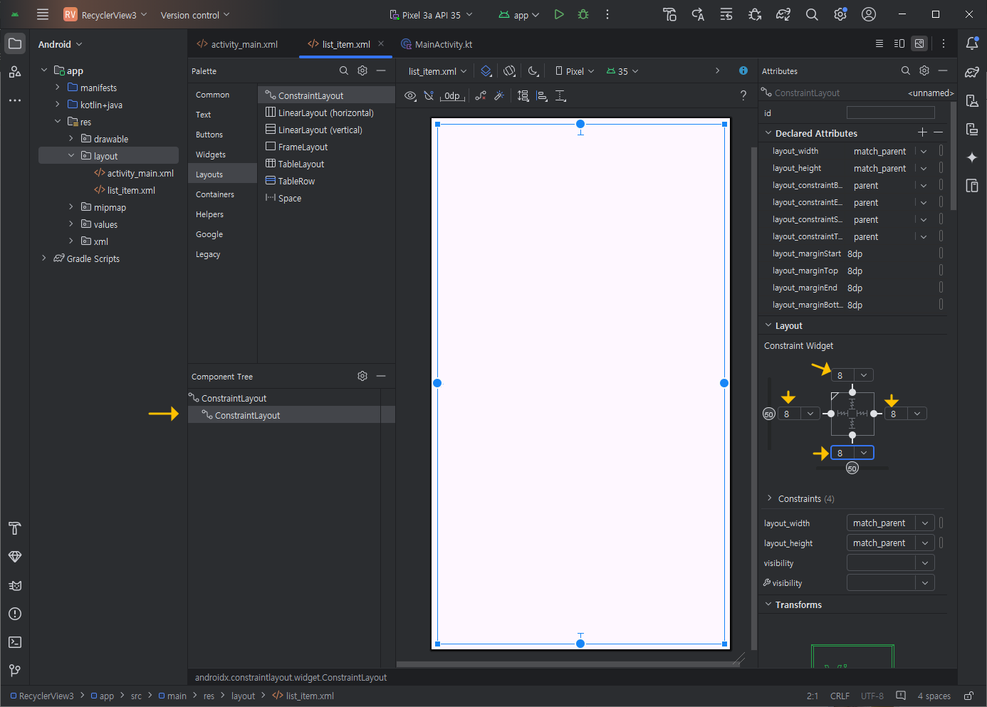 그리고 Attributes 속성 설정창에 보이는 Constrait Widget에서 화살표로 표시한 부분만 클릭해서 부모 Constraint Layout과 각각 연결시켜 주세요. 이때 연결되는 3곳 각각의 magin은 8 정도로 세팅할게요.