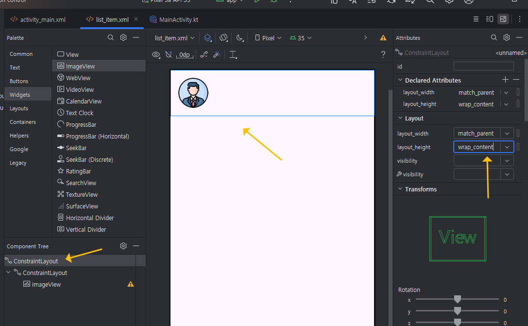 다음, 제일 위에 있는 부모 ConstraintLayout을 선택해서 동일하게 layout_height를 wrap_content로 감싸주게 되면 아래 이미지처럼 이미지가 위쪽으로 정렬이 됩니다.