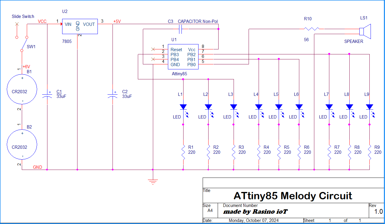 3V의 CR2032배터리는 직렬로 연결하여 6V의 입력 전압을 만들어 주었고요, ATtiny85 칩의 동작전압은 2.7~5.5V인데 6V정도의 전압은 별문제는 없겠지만, 9V건전지 등 다른 전원을 사용할 때를 대비해서, 5V의 고정적인 출력으로 제어해 주는 7805 정전압 IC를 추가하였어요. (tiny85 IC보호)