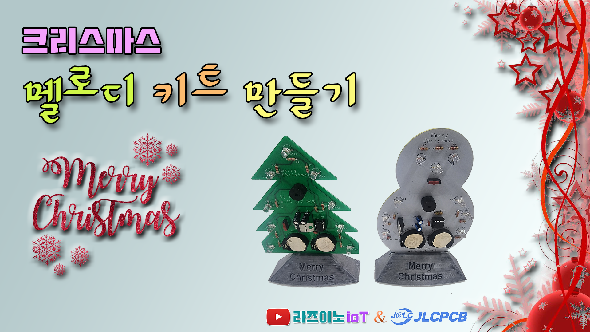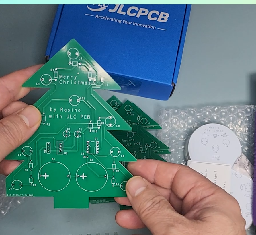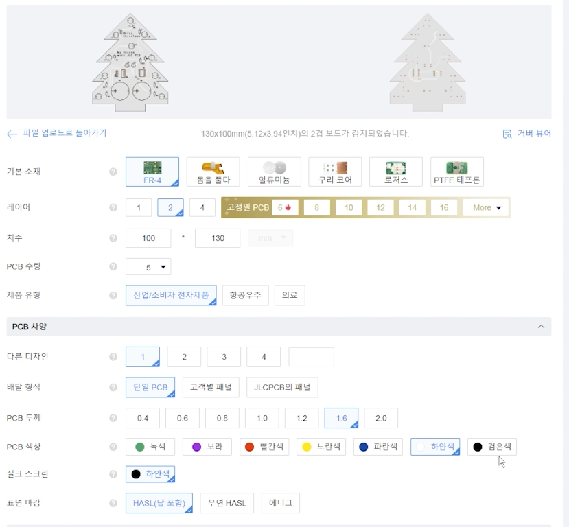 크리스마스트리와 눈사람 두 가지 버전으로 만들었는데요, 하지만, 가정에서는 PCB를 직접 제작하기 쉽지 않죠, 그런데 JLC PCB 사이트 같은 곳을 이용한다면 적은 비용으로 쉽고 빠르게 이렇게 완성된 PCB기판을 받아 볼 수 있습니다.