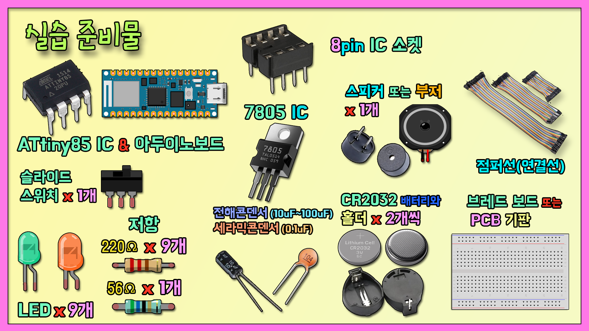 당장 PCB기판이 없더라도 브레드 보드에 회로를 구성해서 실습해 볼 수 있도록 브레드보드를 준비하면 됩니다.