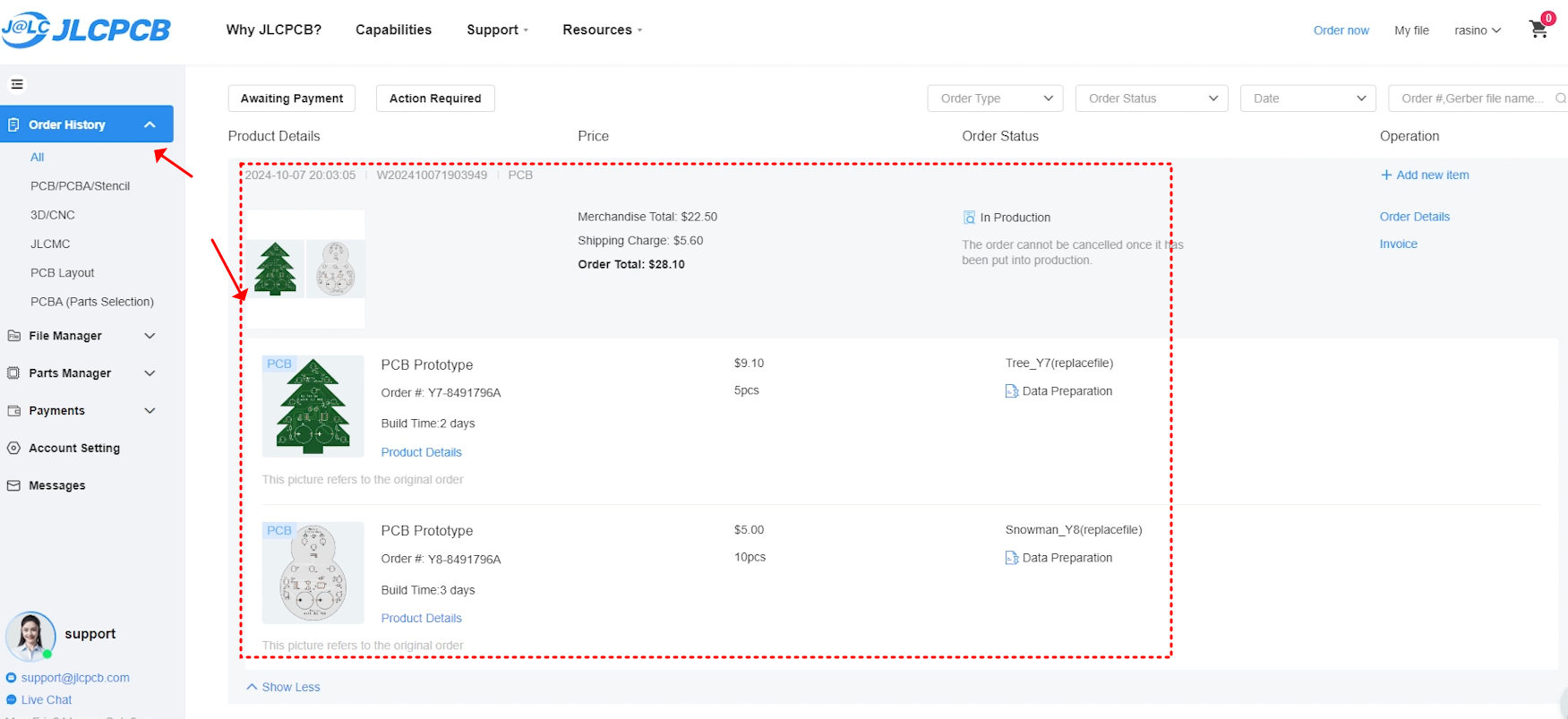 결제 후 주문내역보기(Order history)로 들어가 보면, 데이터 확인을 하고 주문제작에 들어가게 됩니다.