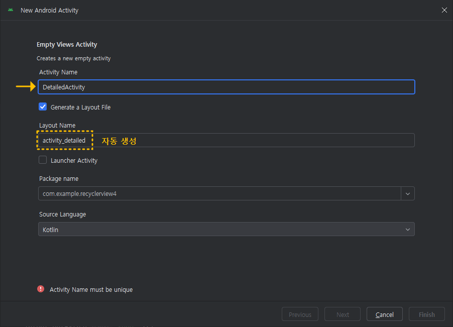 아래처럼 Activity Name에 "DetailedActivity" 를 입력하면 "DetailedActivity.kt"파일과 함께 그 아래에 activity_detailed.xml 파일도 함께 자동 생성됩니다.