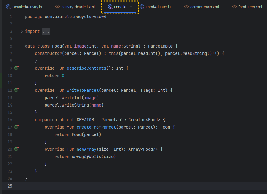 companion object CREATOR : Parcelable.Creator<Food> {