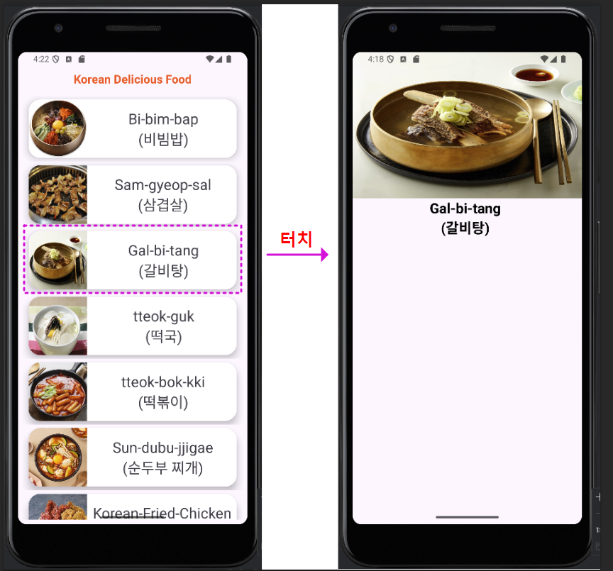 여기서 한 가지 기능을 더 추가해 볼게요, 화면을 스크롤하면서 원하는 음식(이미지)카드를 터치하면, 해당 음식에 대해 디테일하게 정보를 보여주는 View를 추가해 볼게요.