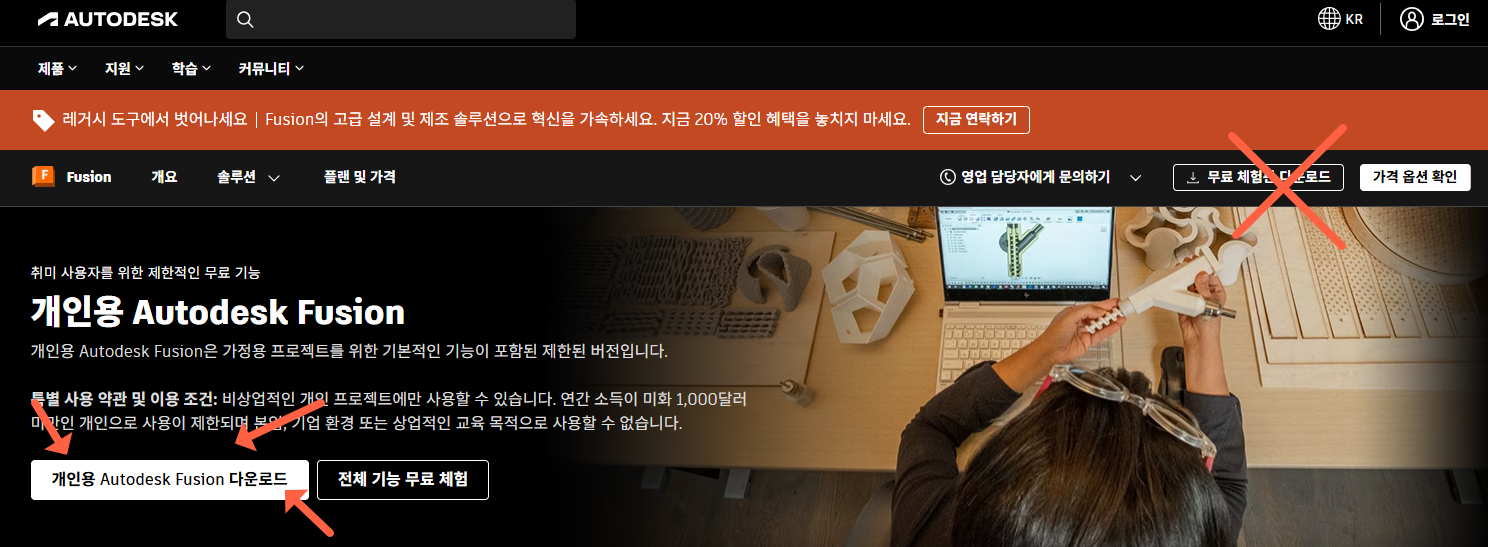 ② 다음 경로에서 반드시 개인용 Autodesk Fusion 다운로드 클릭하여 다운로드 받고 설치 진행(기존 가입 사용하던 이메일 사용가능함) https://www.autodesk.com/kr/products/fusion-360/personal