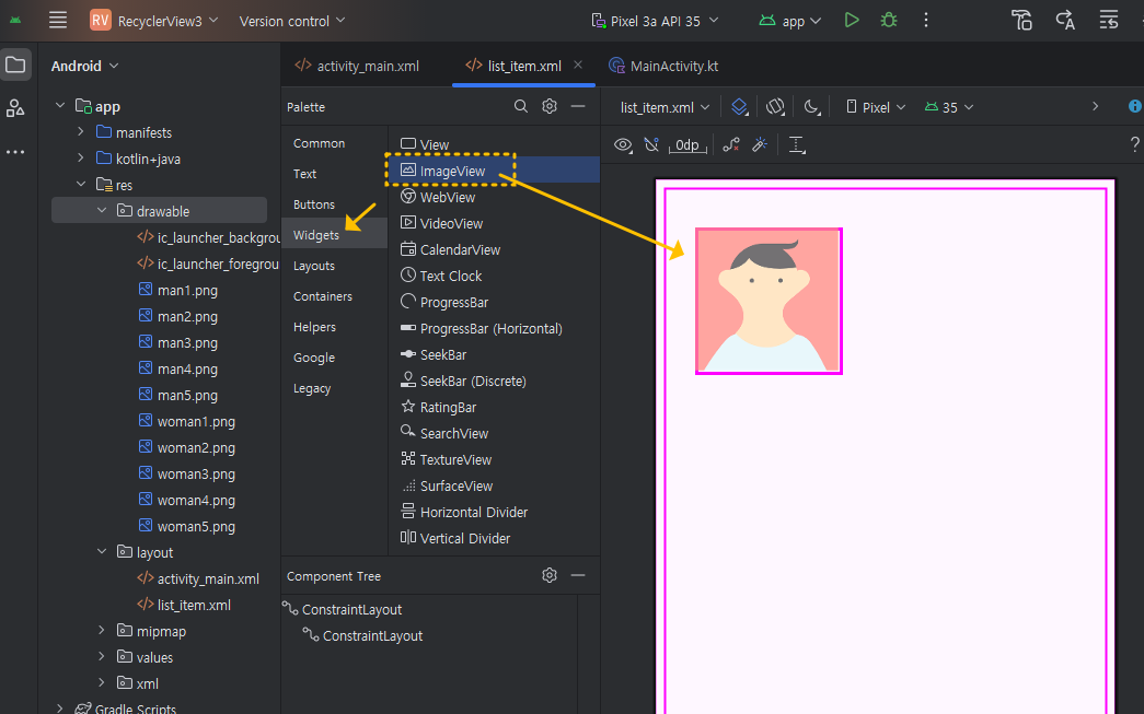 그리고 삽입한 man 이미지의 가로 폭(layout_width)과 세로 높이(layout_height)를 60dp로 설정해 주세요.