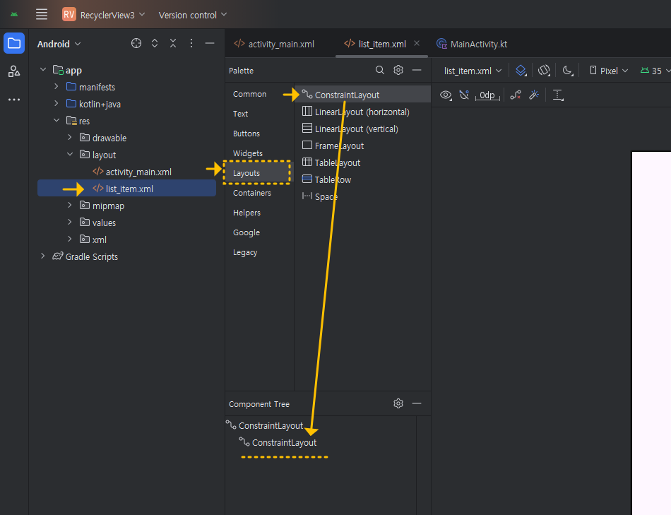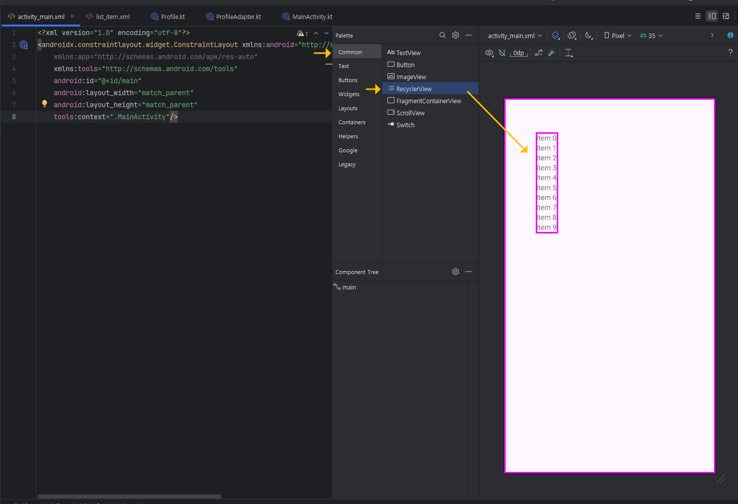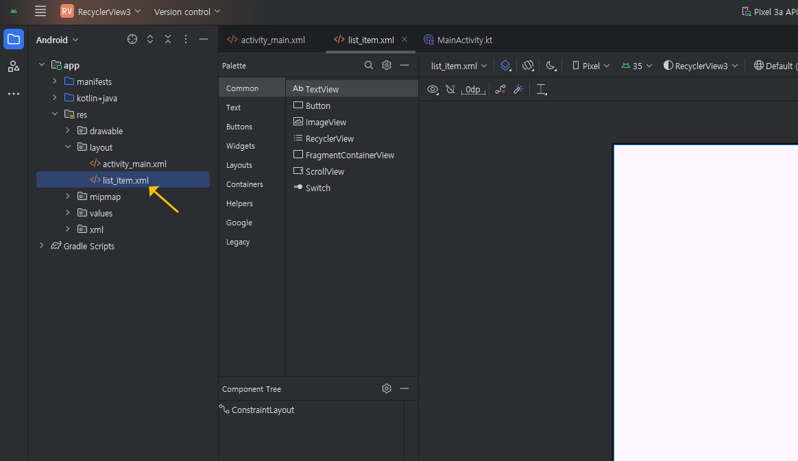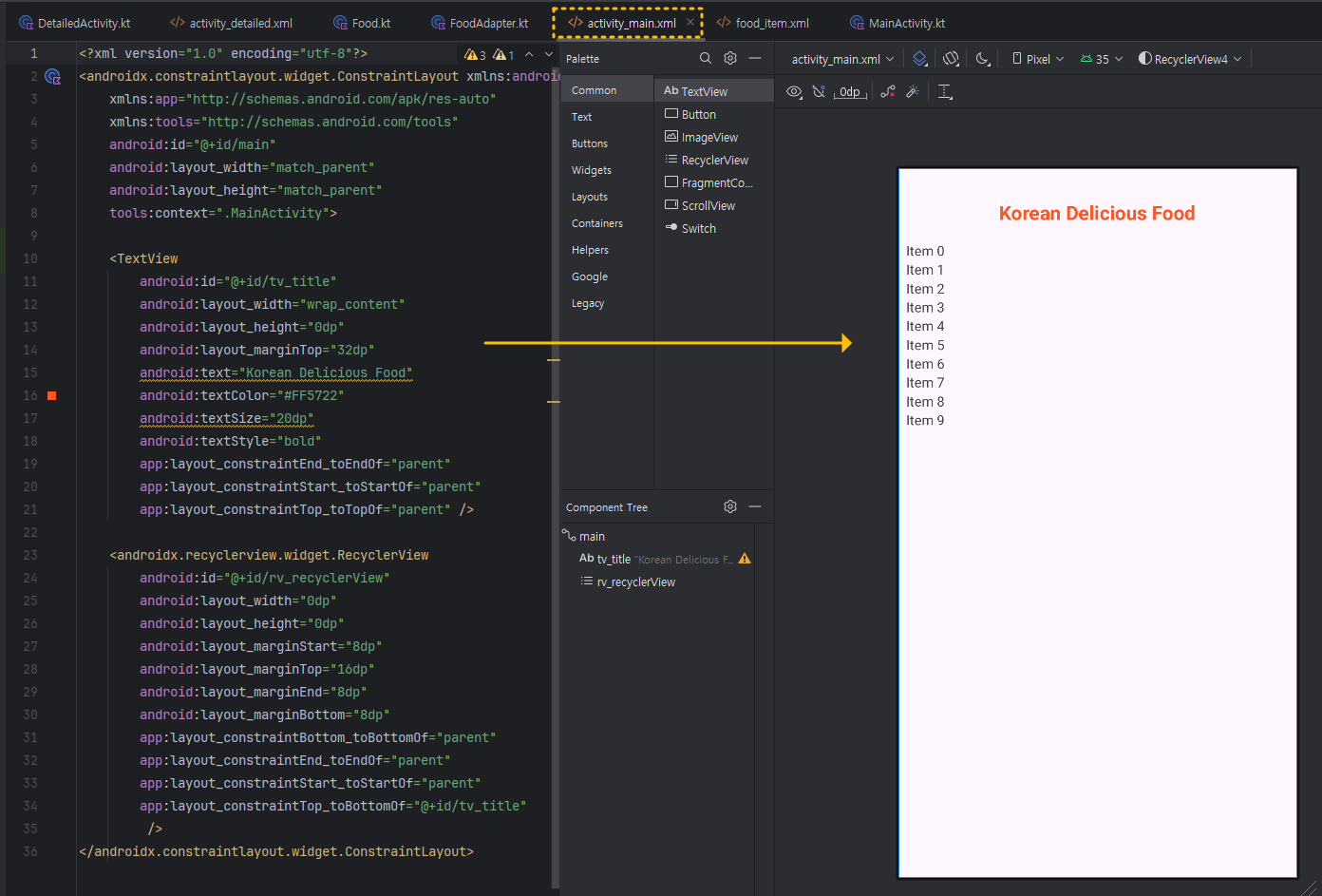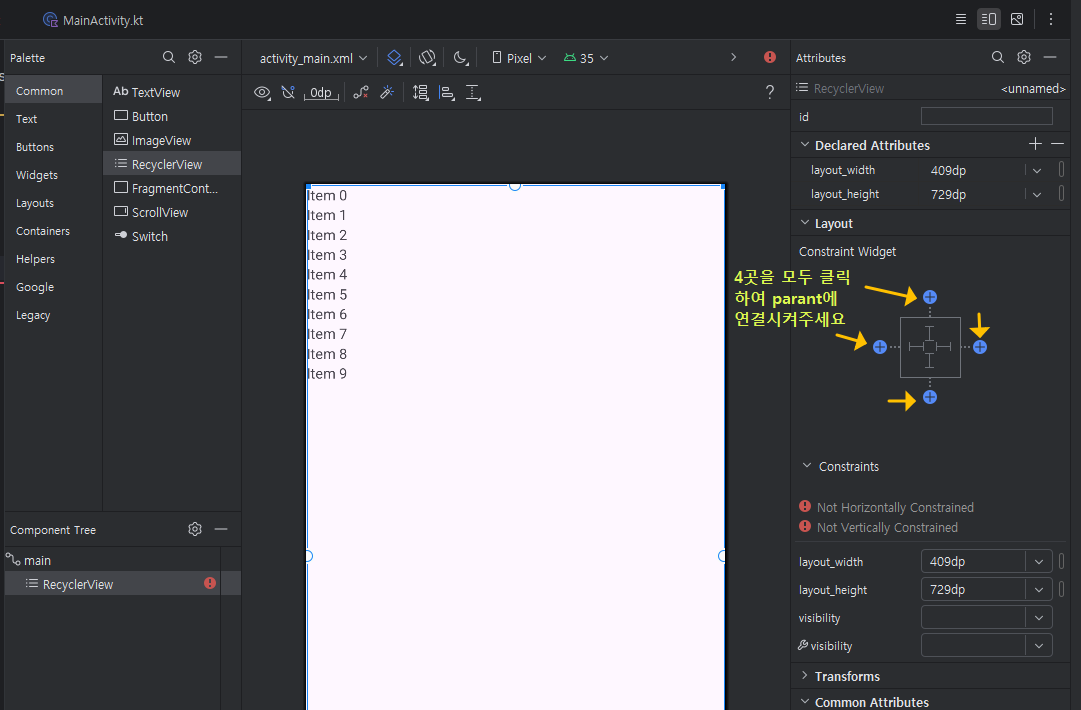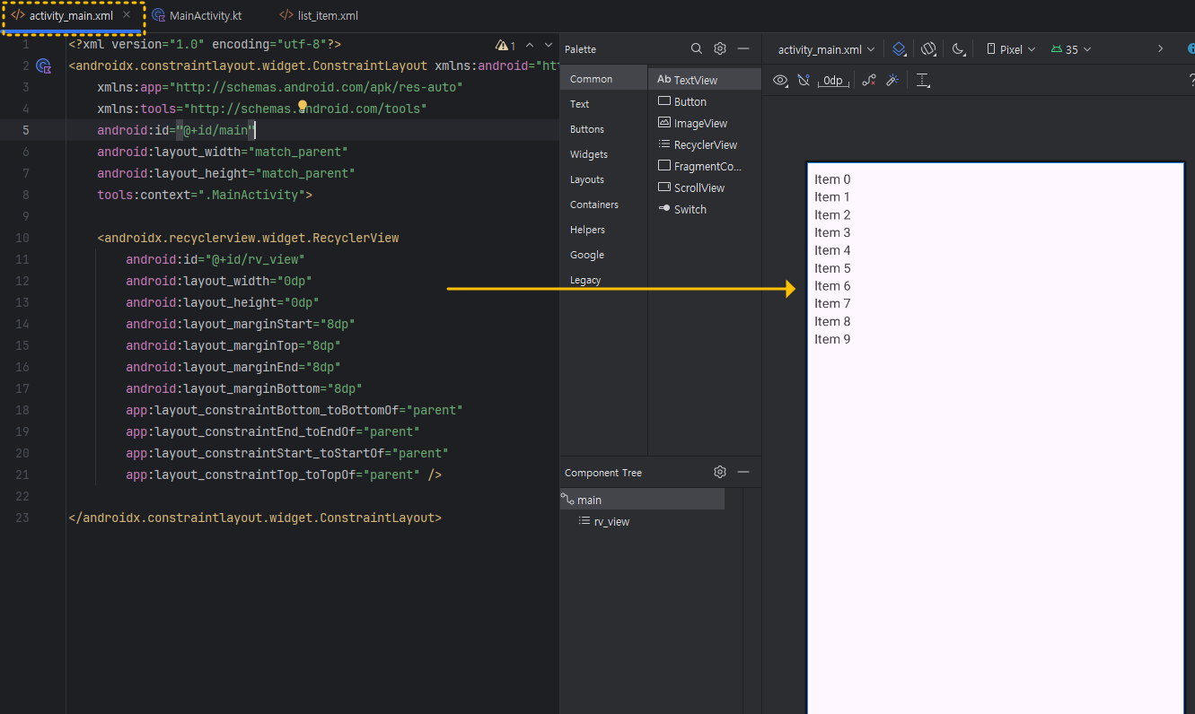 MainActivity.kt 파일을 열고서, 기본 주어지는 "HolloWorld!" textView를 지우고, 아래처럼, Common 》 RecyclerView를 끌어다 놓으세요.