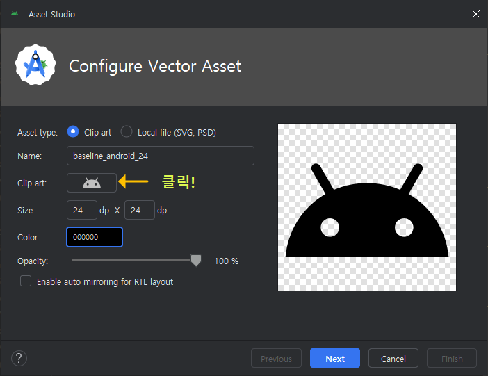Vector Asset창이 열리면 Clip art를 클릭하세요.