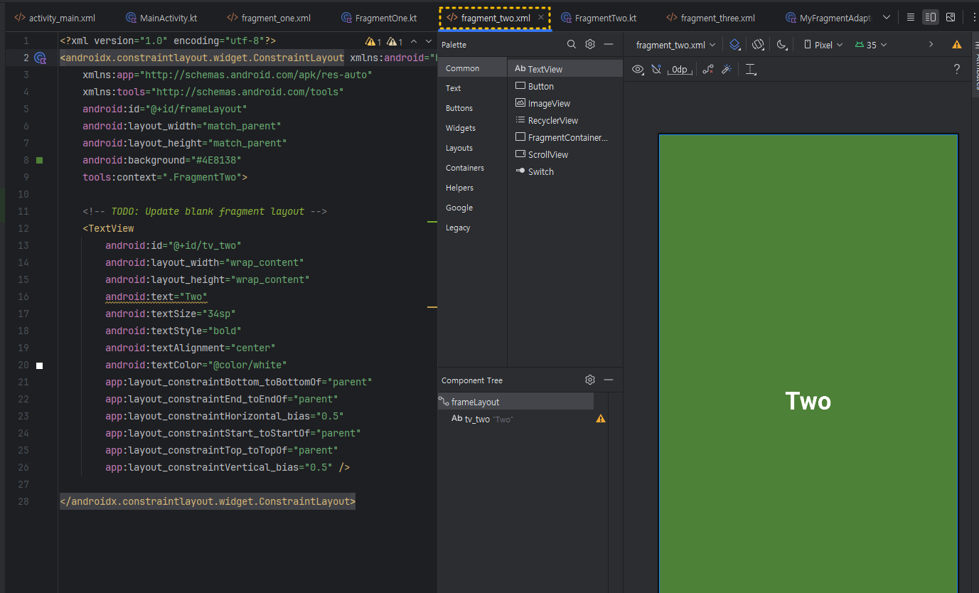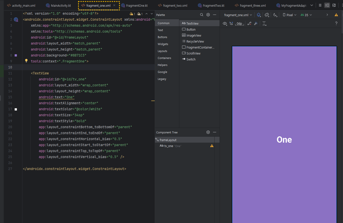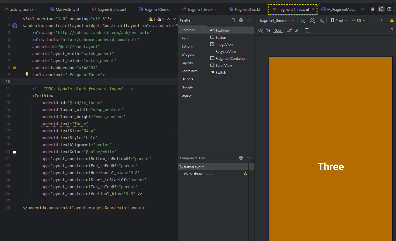 3. fragment_one.xml 과 fragment_two.xml , fragment_three.xml 파일 작성하기 아래처럼 적당한 색상과 배경으로 3개의 파일의 id를 서로 다르게 하여 작성해 주세요. (단, 이번 실습에서는, FrgmentOne~Three.kt 클래스 파일의 내용은 사용하지 않기 때문에 자동 생성된 형태 그대로 두세요) ① fragment_one.xml
