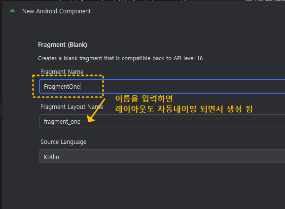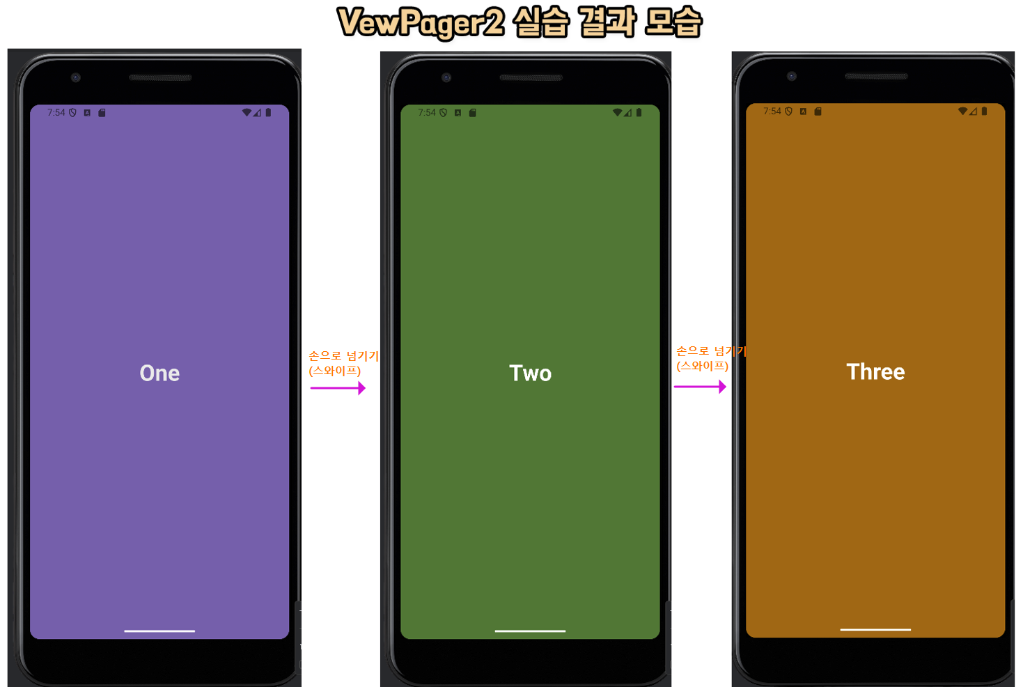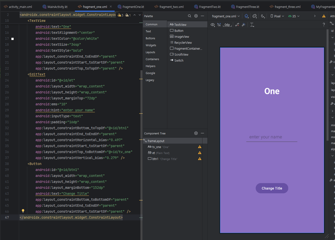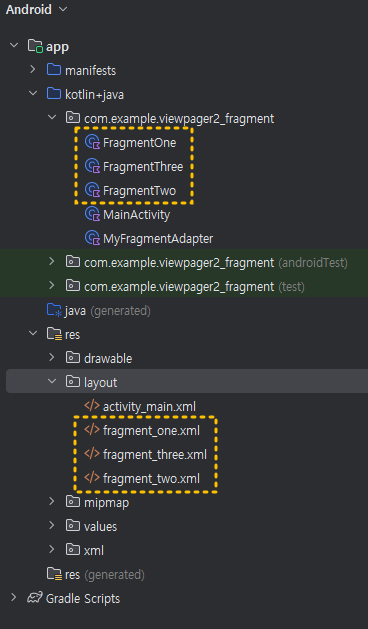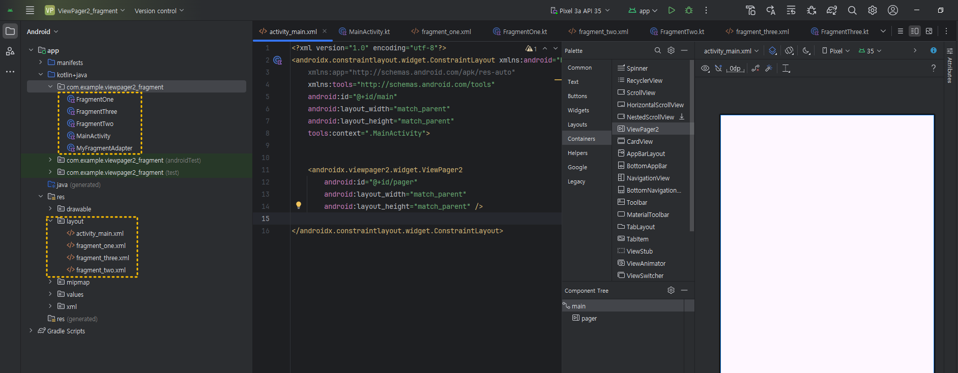 3. fragment_one.xml 과 fragment_two.xml , fragment_three.xml 파일 작성하기 아래처럼 적당한 색상과 배경으로 3개의 파일의 id를 서로 다르게 하여 작성해 주세요. (단, 이번 실습에서는, FrgmentOne~Three.kt 클래스 파일의 내용은 사용하지 않기 때문에 자동 생성된 형태 그대로 두세요) ① fragment_one.xml