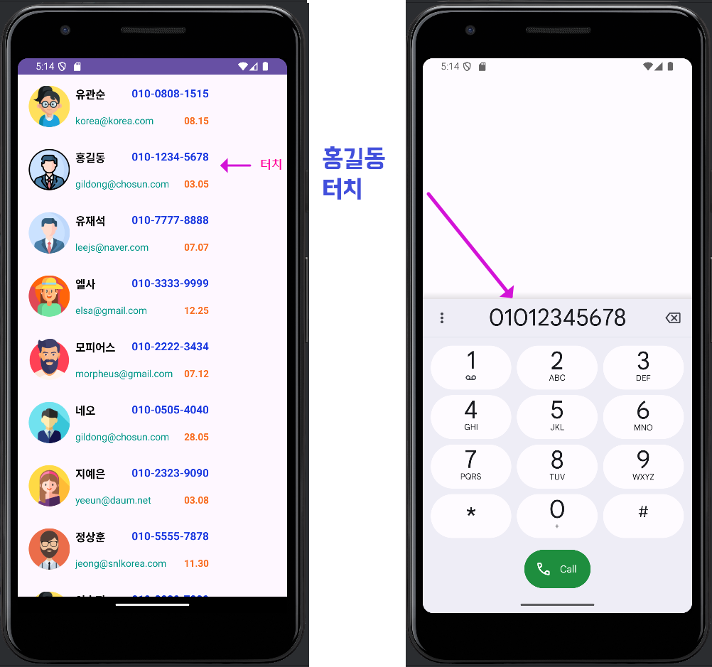 앱을 실행시켜 보면, 서로 다른 항목을 클릭할 때마다 그 항목에 있는 전화번호로 전화 걸기가 잘 실행 되는 것을 볼 수 있네요.