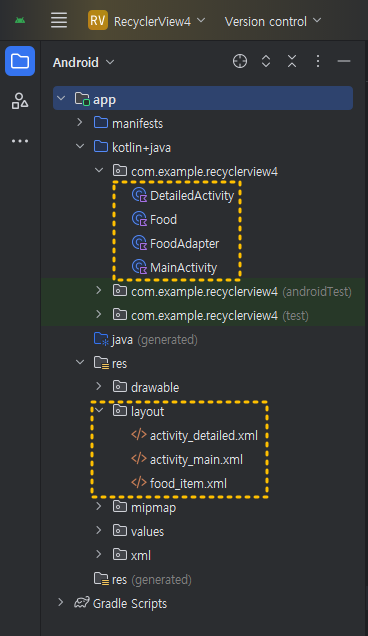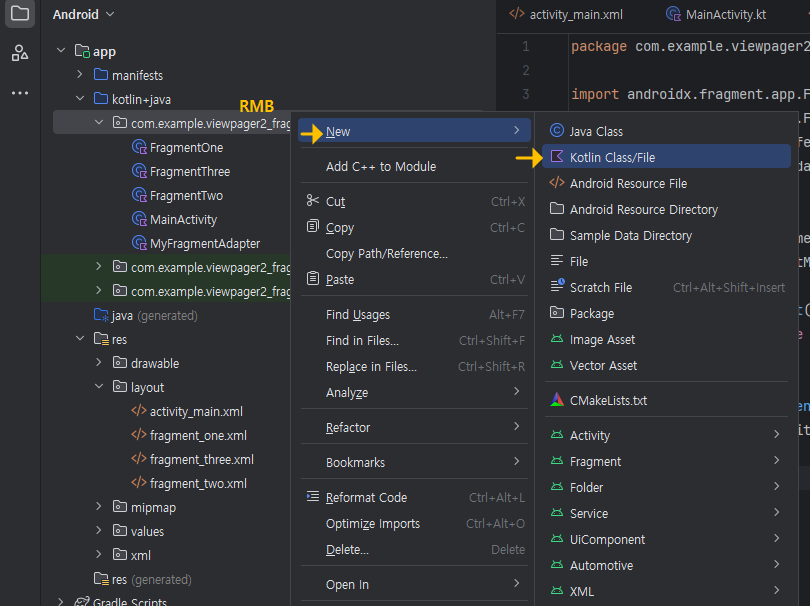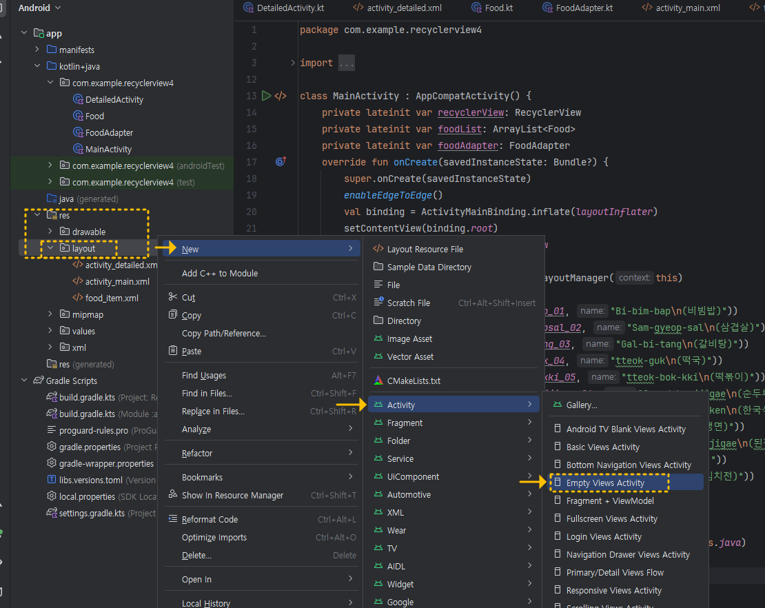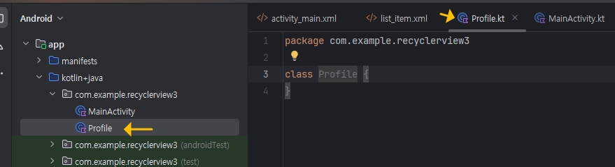 app 》 kotlin+java 》 com.example.recyclerview3 <RMB> 해서 New 》 Kotlin Class/File을 클릭하세요.