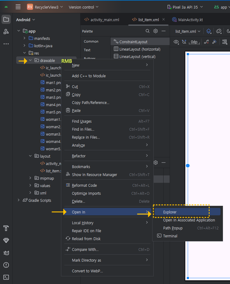 그럼, 아래와 같이 layout 폴더에 list_item.xml이라는 파일이 생성된 것을 볼 수 있어요.