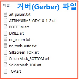 패턴을 완성시킨 후 인쇄회로기판(PCB)을 출력하기 위한 각 층별 팬턴에 대한 필름을 생성하고, 그리고 부품을 삽입하기 위한 홀 드릴에 대한 정보 파일과 Tree 모양의 기판 형태를 제단 해주는 NC 데이터도 함께 만들어 주는데요, 이 파일들의 묶음을 거버(Gerber) 파일이라고 합니다.