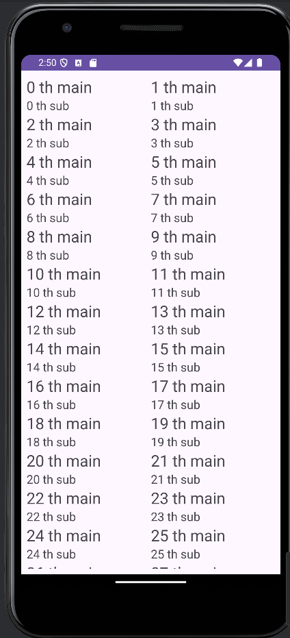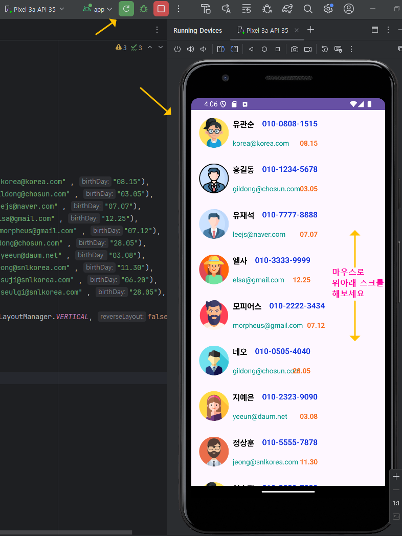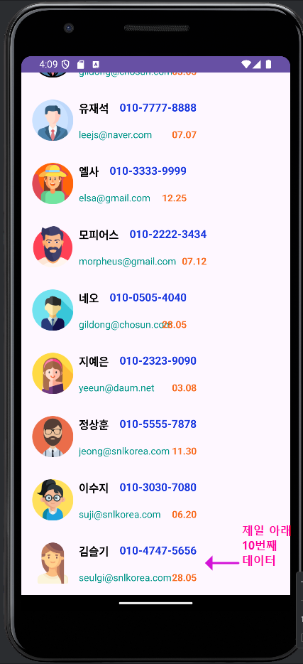 에뮬레이터에 뜬 화면을 마우스로 위아래 스크롤 해보면, 준비된 10개의 데이터가 스크롤되면서(VERTICAL) 잘 보이는 걸 알 수 있어요.