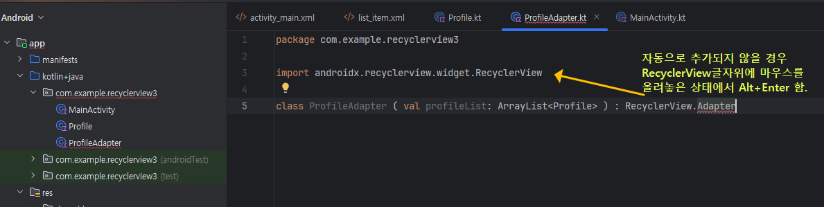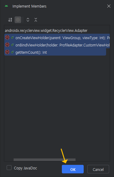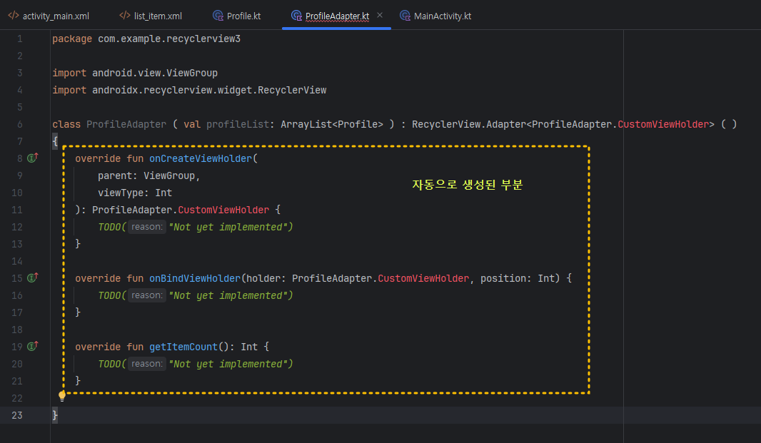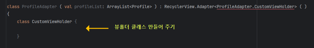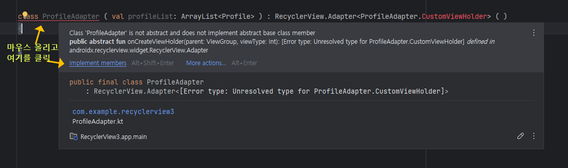 그리고 아래처럼 코드를 이어서 작성하면, class ProfileAdapter 부분이 붉은색 밑줄이 그어지는데 마우스를 올리고 나타나는 팝업창에서 Implement members를 클릭해서 필요한 구성요소들이 자동으로 생성될 수 있도록 해줍니다. 또는 Alt+Shift+Enter