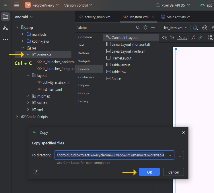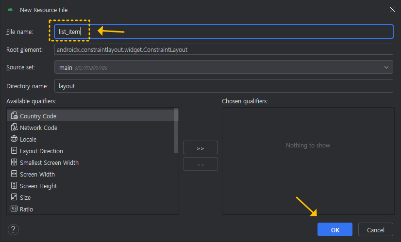 File name : 에 list_item이라 적고 OK를 클릭해 주세요.