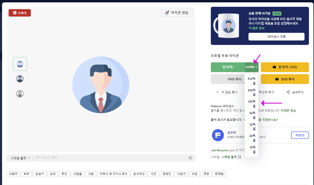 128픽셀을 선택해서 다운로드하세요. 512픽셀로 받아도 되지만, 기본크기가 너무 커지므로 줄여서 받아볼게요.