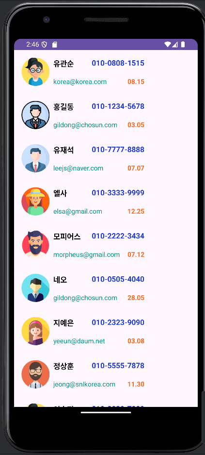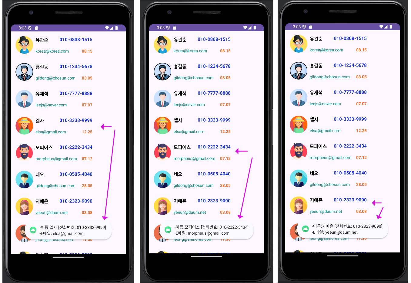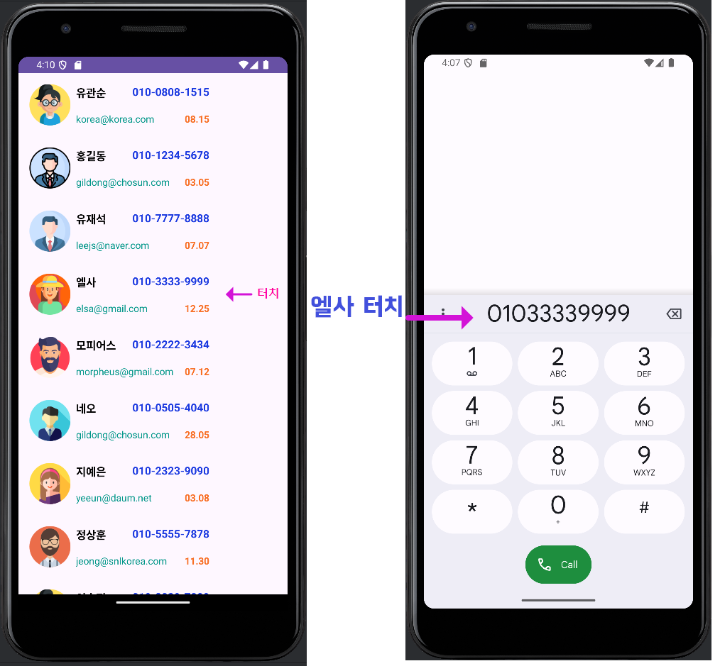 예를 들어, itemView 목록에서 엘사를 터치하면, 엘사의 "이름 [전화번호] , 이메일"을 짧은 메시지 형태로 보여주도록 할게요.