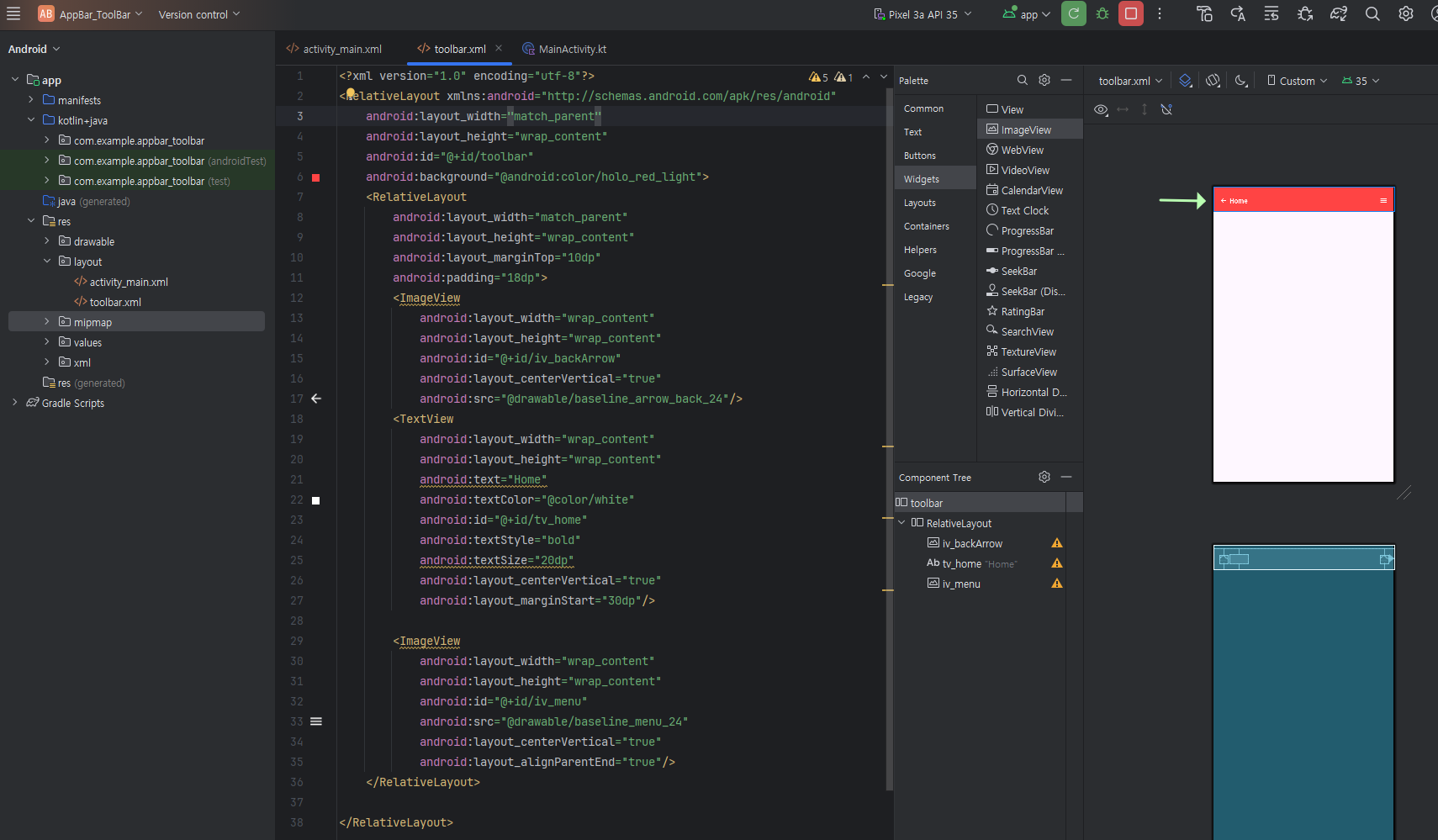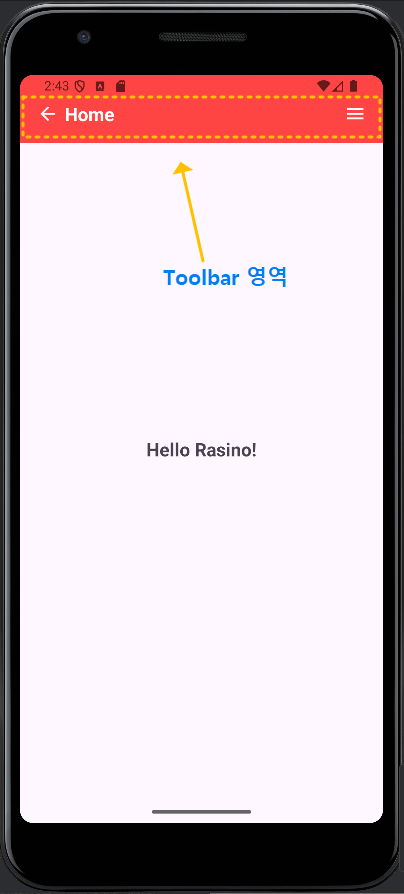ToolBar(툴바)란, 위 액션바의 큰 단점을 해결하기 위해, 안드로이드 버전이 달라지더라도 동일한 동작(액션)을 하도록, 안드로이드 5.0 (API Level 21)부터 추가된 위젯(Widget)을 말하는데요, 주로 이 툴바를 사용하여 편리하게 앱바(AppBar) 영역을 만들 수 있도록 하였습니다. 그리고 위젯을 직접 사용하지 않더라도 기본적으로 activity_main.xml에 toolbar.xml을 추가(include)하여 툴바 기능을 하도록 처리할 수 있습니다.