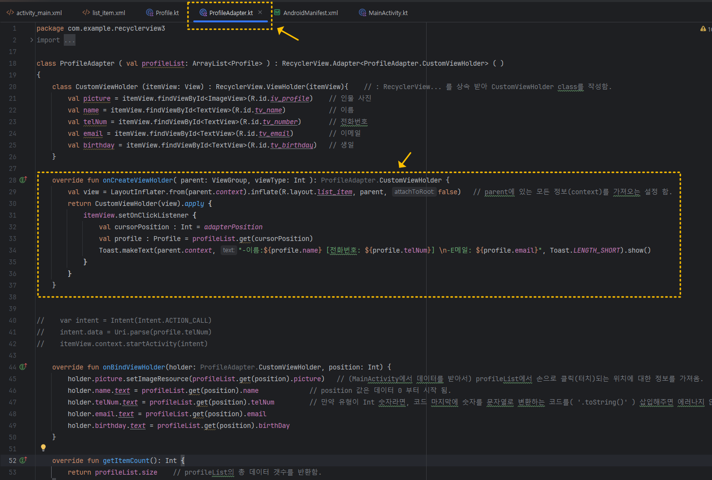 ProfileAdapter.kt 파일을 열고, onCreateViewHolder ( ) 함수 부분을 아래와 같이 수정(추가) 해 주세요.