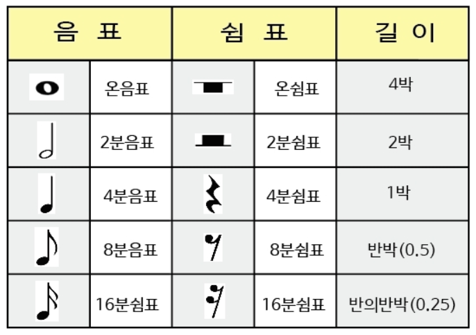 그리고 음에는 음의 길이를 정해 줄 수 있는데요, 음의 길이에 따라 그림과 같은 음표로 구분해서 악보에 표시합니다.