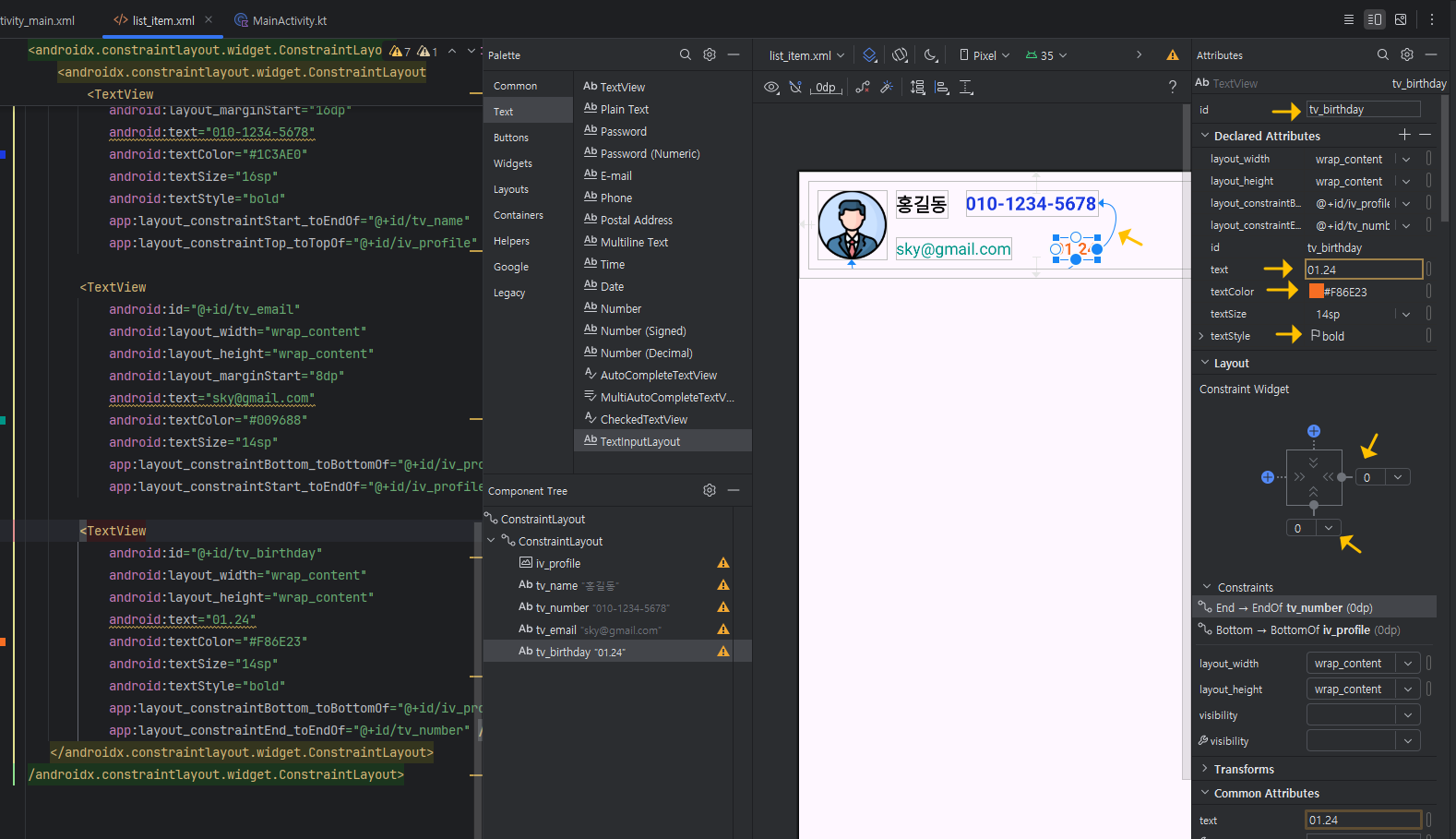 ④ 동일하게 생년월일에 대한 tv_birthday texView도 아래처럼 추가해 볼게요.