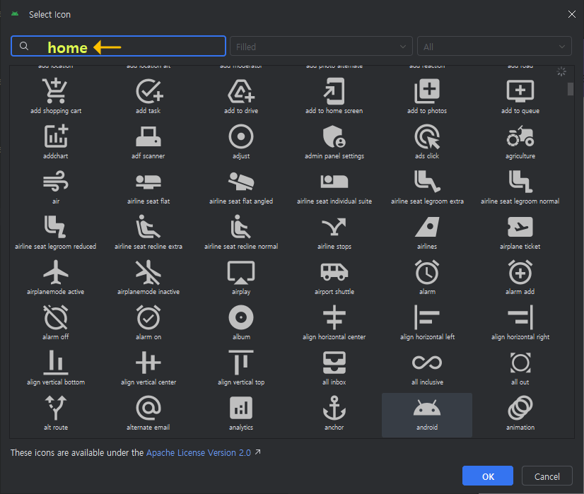 검색창에 "arrow"로 검색하고 "arrow back"를 선택 후, OK 클릭하세요.
