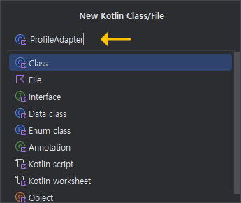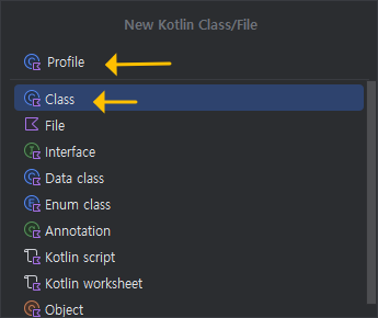 Profile이라는 확장자가 KT인 코틀린 Class 파일이 생성된 것을 볼 수 있어요.