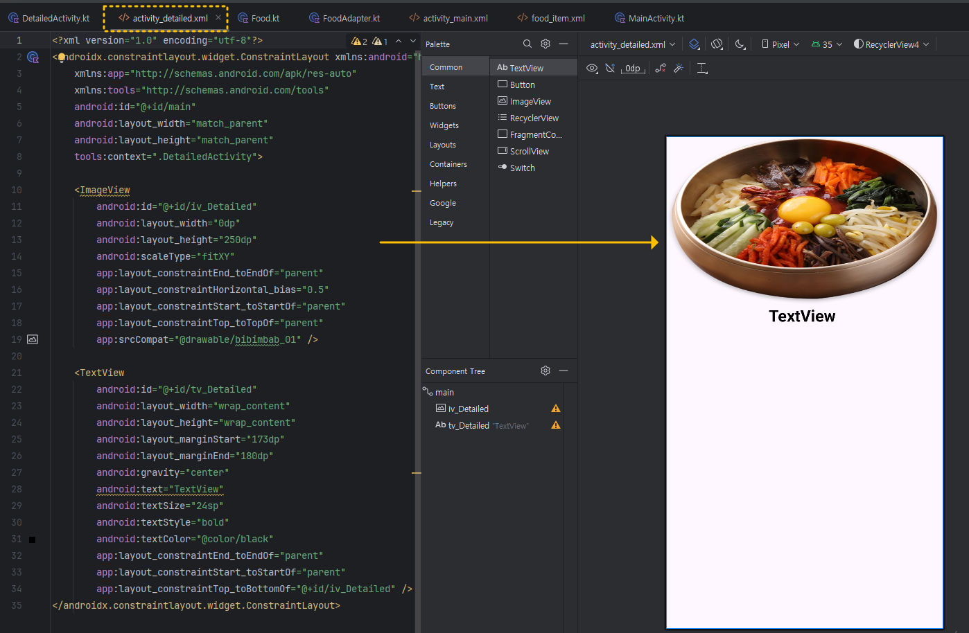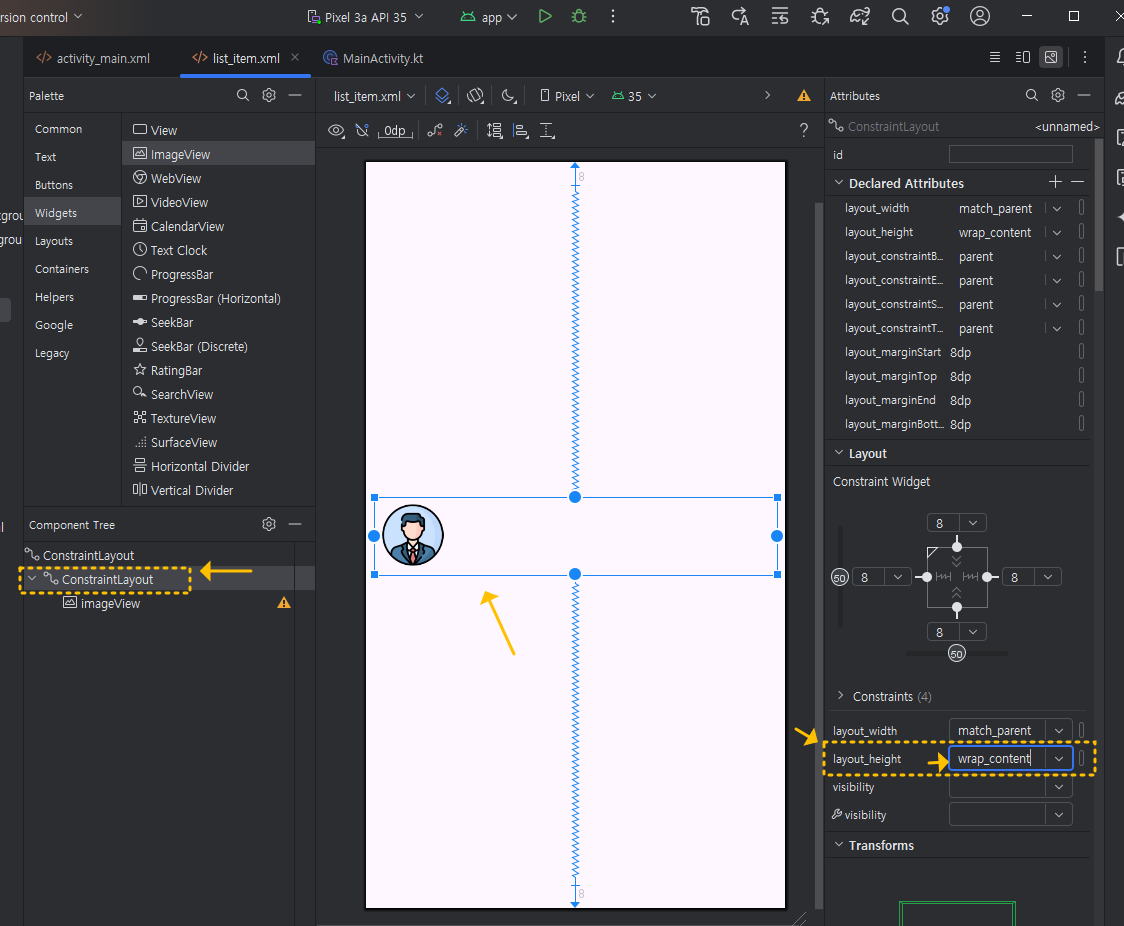 다음, 제일 위에 있는 부모 ConstraintLayout을 선택해서 동일하게 layout_height를 wrap_content로 감싸주게 되면 아래 이미지처럼 이미지가 위쪽으로 정렬이 됩니다.