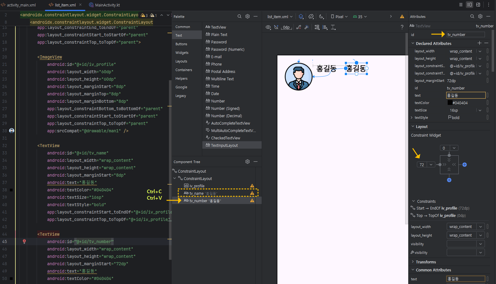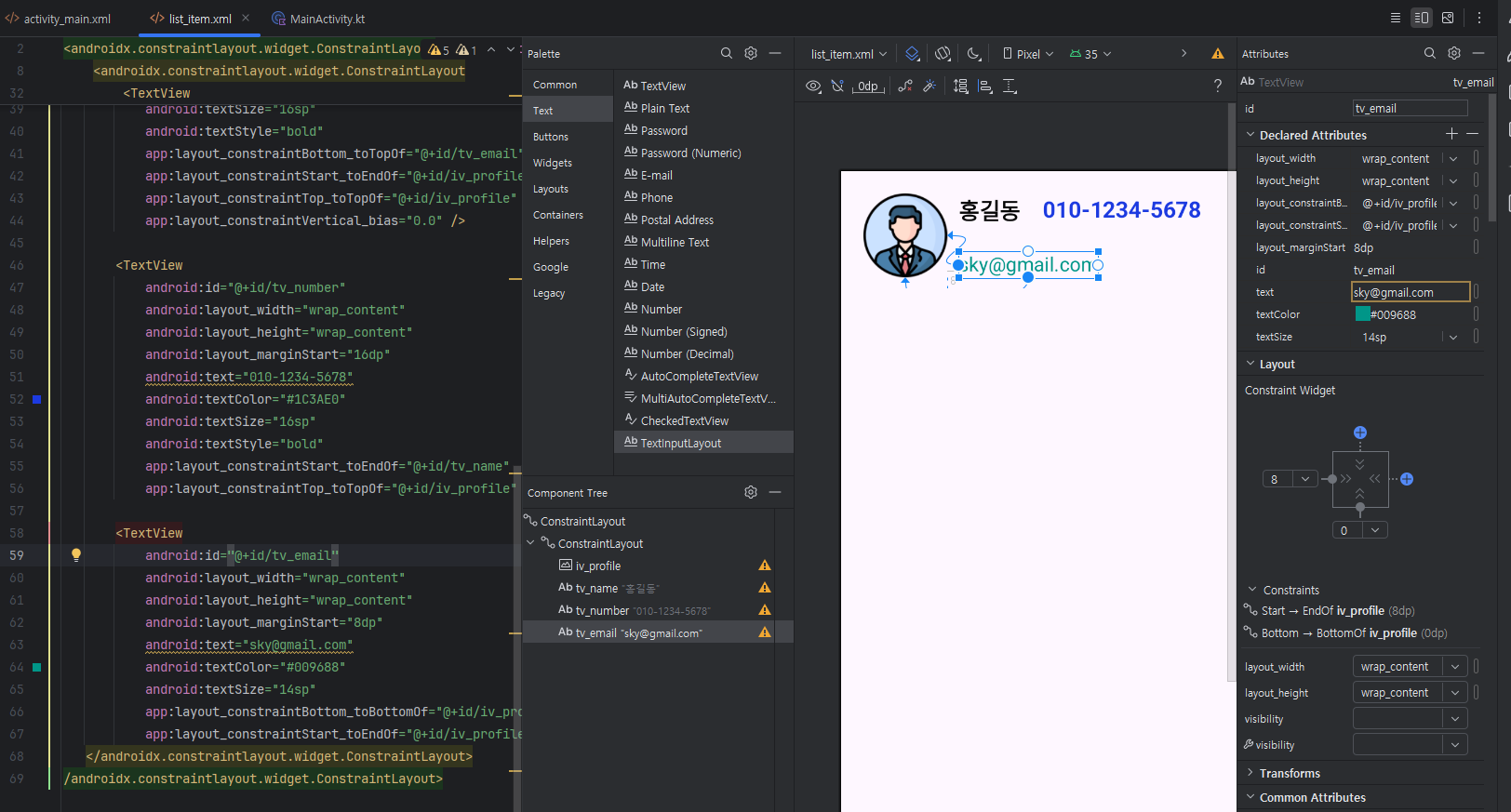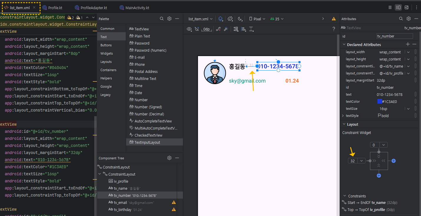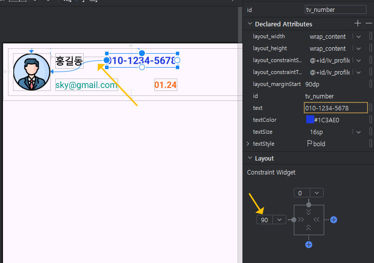 그럼, id = tv_number로 바꾸고, 전화번호를 입력해 주세요. 색상도 적당한 색으로 바꾸고, Constraint Widget의 연결을 왼쪽 이름에 연결하고 정당한 magin을 입력해 주세요.