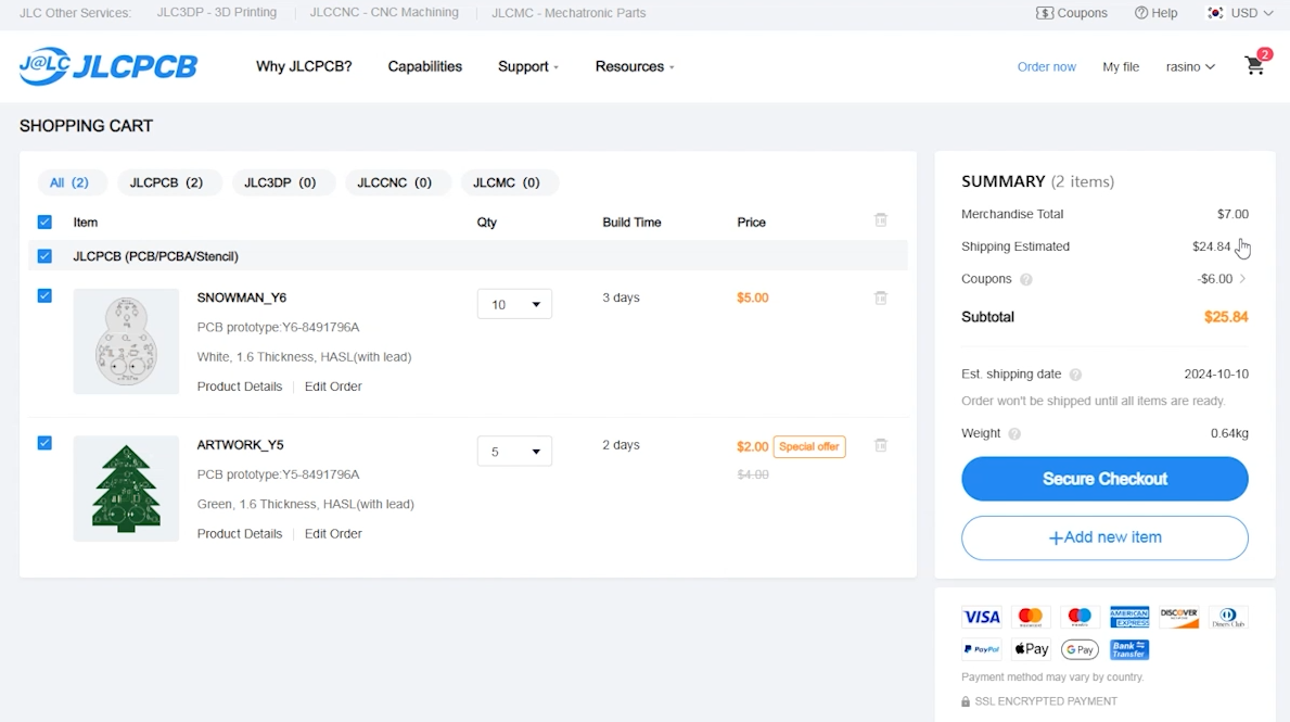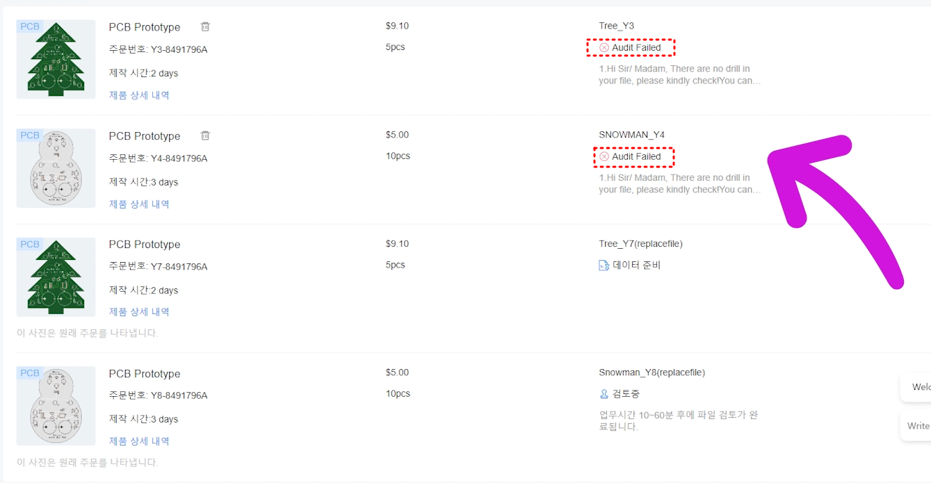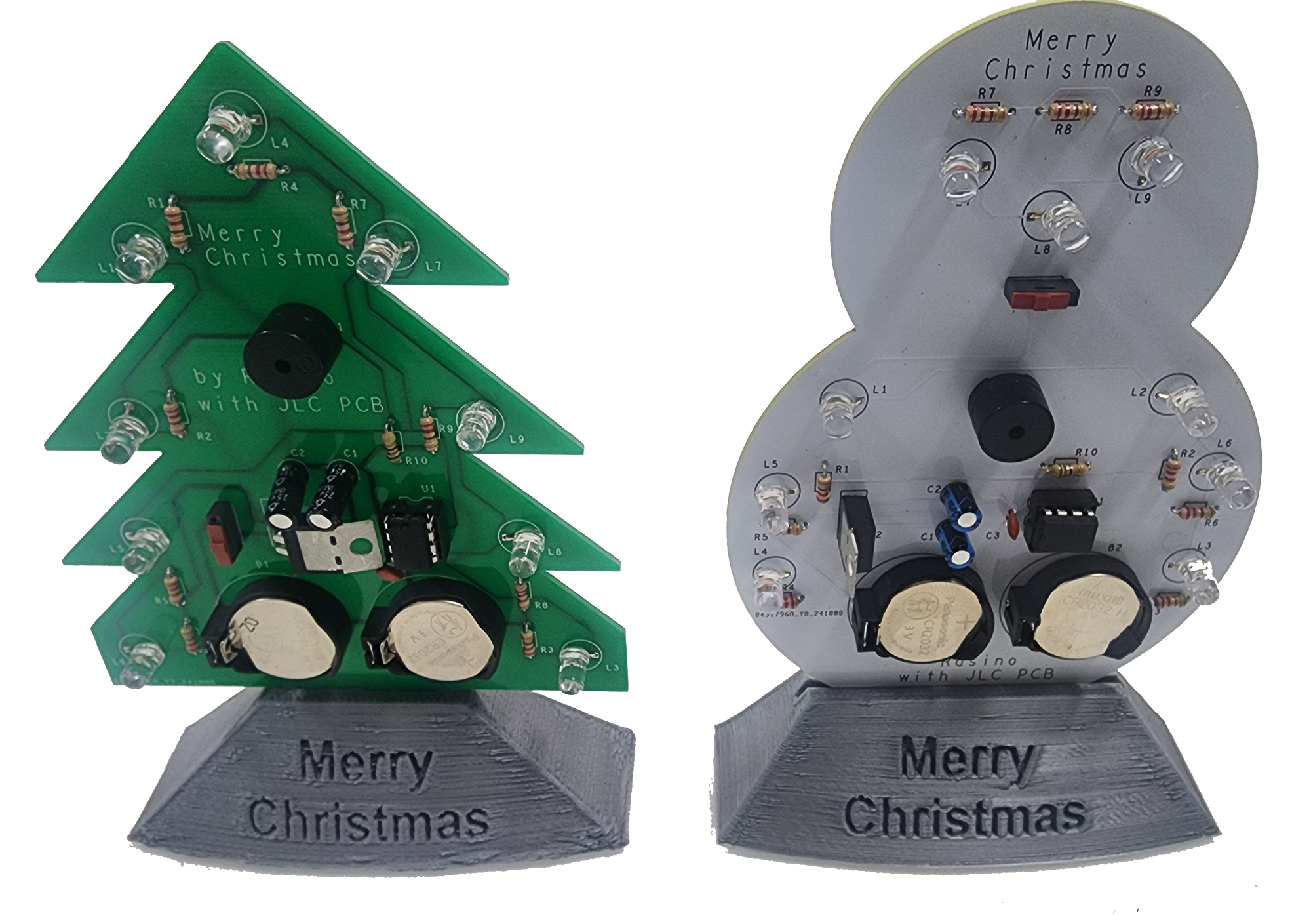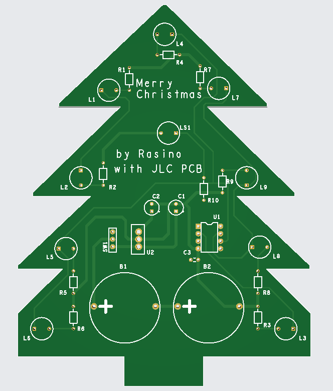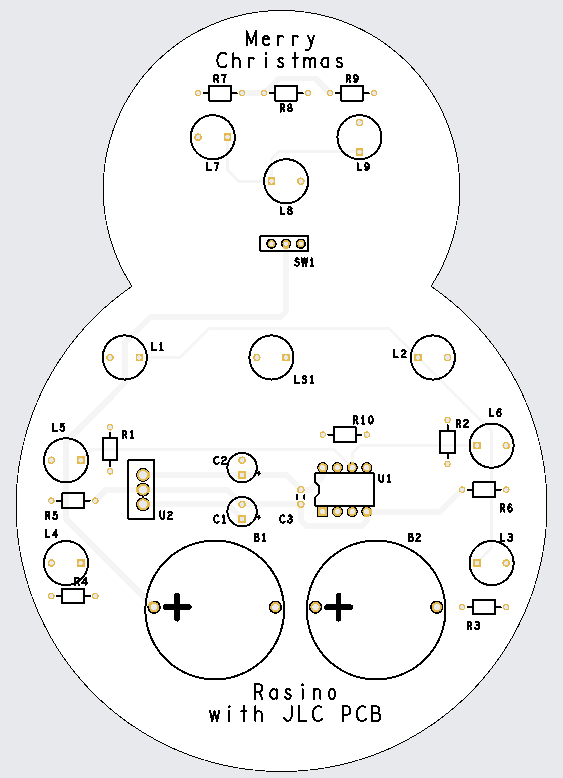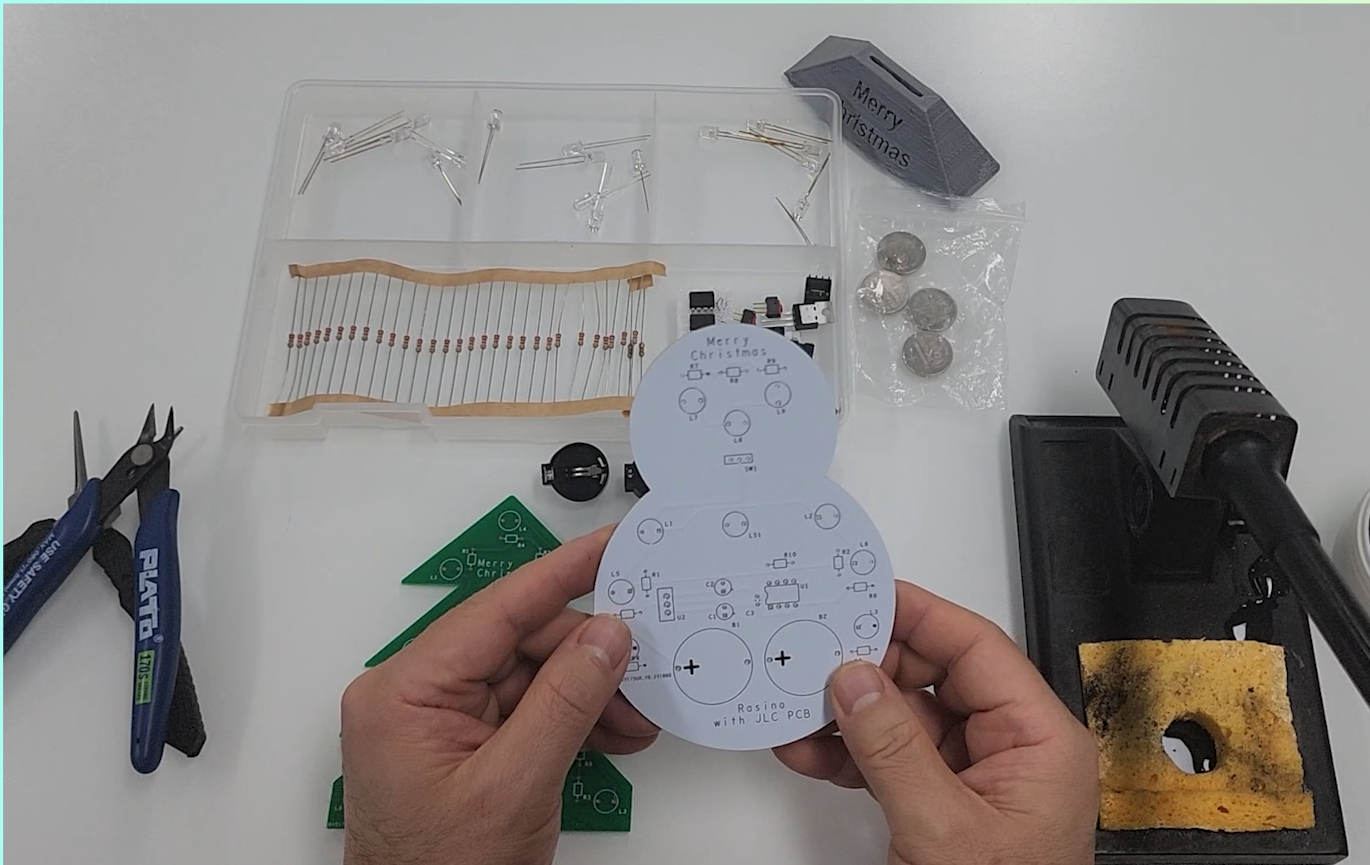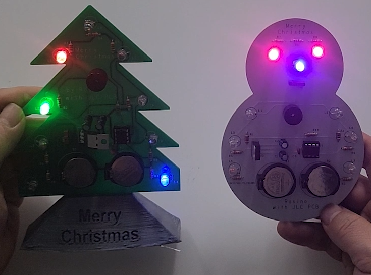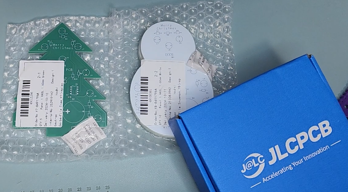 캐롤이나 동요, 혹은 자신이 좋아하는 곡의 멜로디를 코딩하여 키트로 출력할 수 있어요. 아래 이미지처럼 PCB로 제작해서 선물용에 어울리게끔 만들어 봤습니다. 크리스마스트리와 눈사람 두 가지 버전으로 만들었는데요, 하지만, 가정에서는 PCB를 직접 제작하기 쉽지 않죠, 그런데 JLC PCB 사이트 같은 곳을 이용한다면 적은 비용으로 쉽고 빠르게 이렇게 완성된 PCB기판을 받아 볼 수 있습니다.