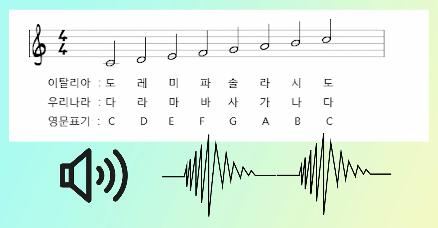 각 음계의 이름을 계이름이라하며 세 가지 언어로 혼용해서 부르고 있습니다. 주로 악보에는 영문 음계로(코드) 표기합니다. 그런데 이런 음(소리)은 어떤 물질의 떨림(진동)에의해 만들어지는데요. 물질이 빠르게 진동한다면 높은 음이 나며, 느리게 진동한다면 낮은음을 발생시키게 되죠. 빠르게 진동하는 것을 주파수가 높다라고 하며, 느리게 진동하면 주파수가 낮다고 해요. 1초에 1회의 진동(떨림)을 주파수 1Hz로 부르며, 100떨리면 100Hz라고 말합니다.