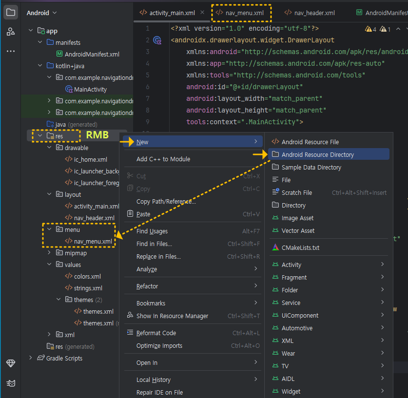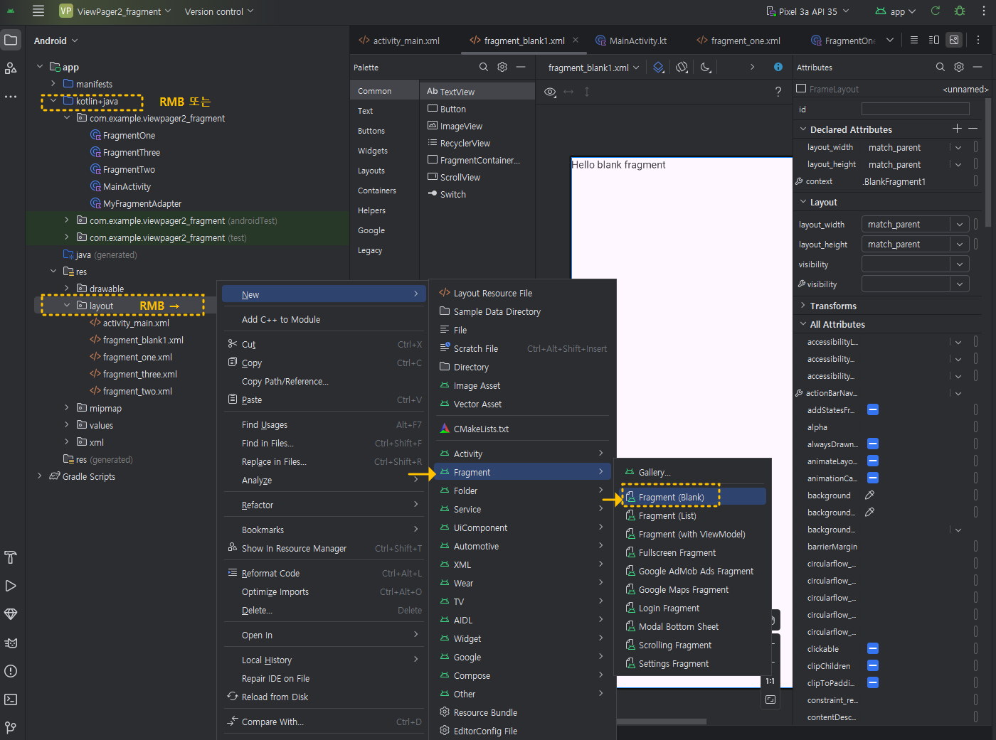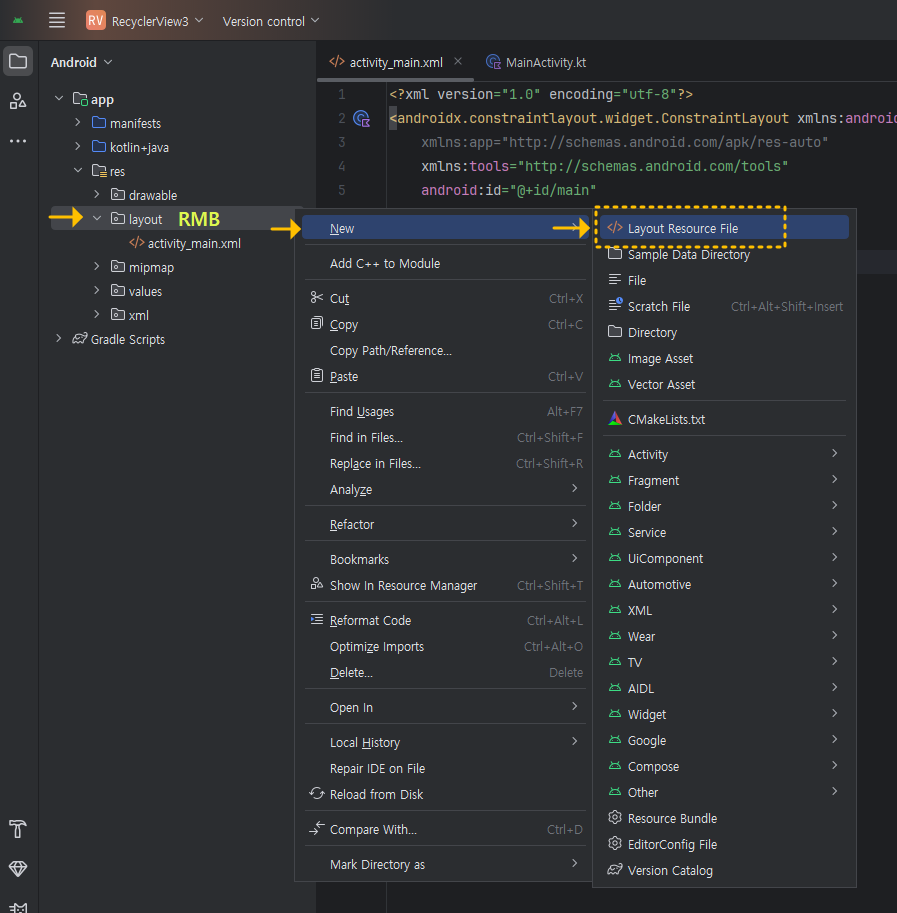 프로젝트 탐색창에서 res 》 layout 에서 마우스 우클릭(이후로는 RMB로 표현)해서 New 》 Layout Resource File을 클릭하세요.
