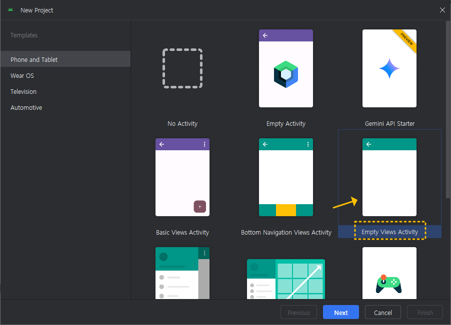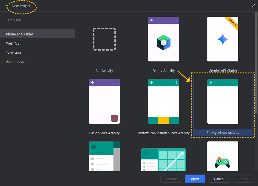 먼저 안드로이드 스튜디오를 실행하고 New Project로 아래와 같이 Empty Views Activity를 선택해 주세요.
