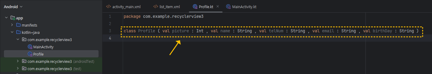 그리고 profileList라는 변수를 만들고 arrayListOf ( )라는 리스트 함수를 사용하여 앞서 정의한 데이터들의 리스트를 담을 거예요.