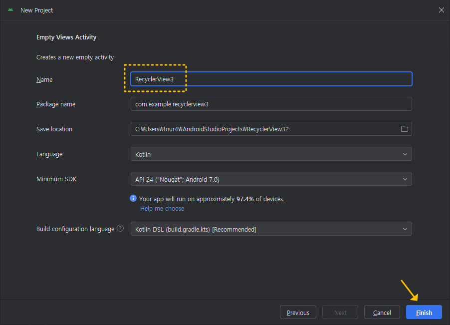 여기서는 프로젝트 이름을 "AppBar_ToolBar"로 했습니다.