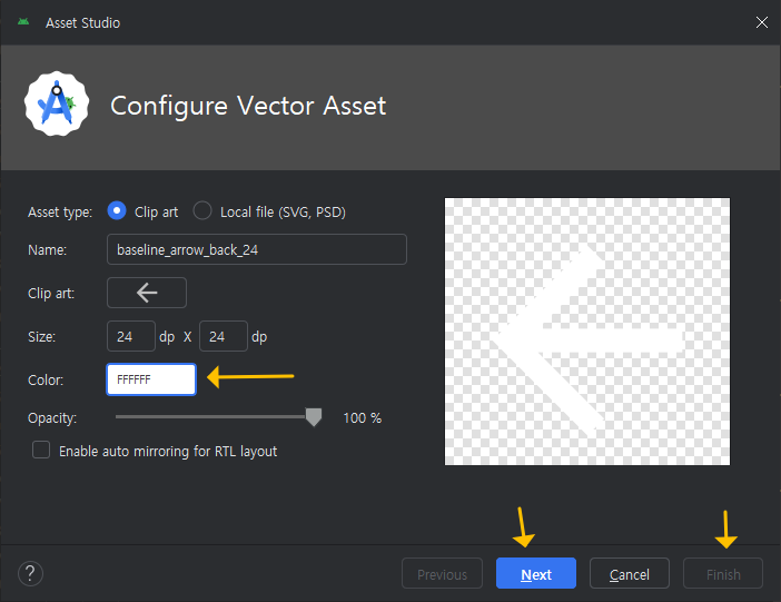 그럼, 안드로이드 스튜디오의 프로젝트 탐색창에 Res >> drawable >> 폴더에 아래와 같이 화살표 파일이 다운로드된 것을 볼 수 있어요.