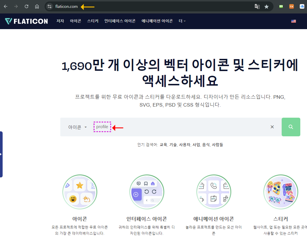우선, 전화번호 목록에 쓰일 사람들의 사진을 대신하여 이미지 아이콘을 다운로드하여 사용해 볼 텐데요, flaticon.com에 접속하여 " profile " 로 검색해서 다운로드하여 볼게요.