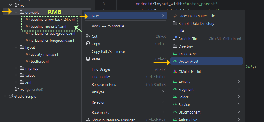 위 코드에서 Item1~3 앞에 아이콘이 나오도록 하려면 넣고 싶은 아이콘 이미지를 res>>drawable 폴더에 넣어주면 되는데요, 여기서는 간편하게 제공되는 클립아트(Clip Art) 기능인, Vector Asset에서 찾아서 넣었습니다. 그럼, 아래와 res>>drawable 폴더를 RMB 해서 Vector Asset을 클릭해 주세요. 여기서는 모두 동일한 집(Home) 아이콘을 선택했어요.