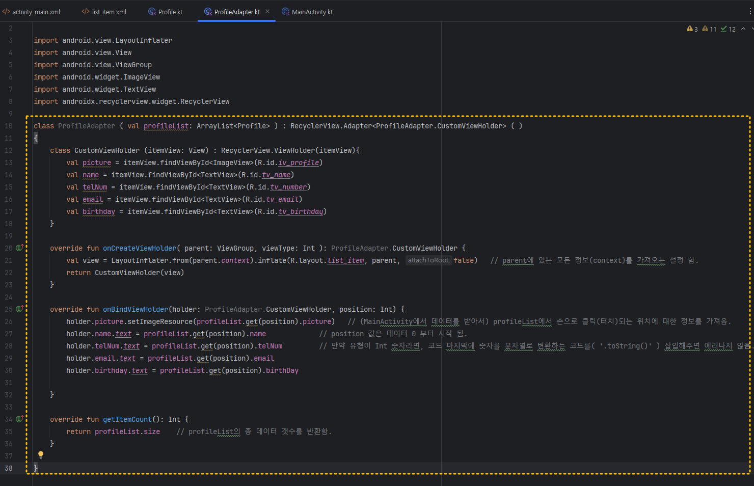 그리고 레이아웃매니저(layoutManager) 함수를 통해 어댑터가 만든 항목들을 어떻게 배치할지? (가로:HORIZONTAL, 세로:VERTICAL) 정해줍니다. 주로 위아래로 스크롤하는 형태가 되기 때문에, VERTICAL로 해주면 되고요. 이제 제일 중요한, 어댑터를 최초로 사용하게 되는데, ProfileAdapter( )를 가져와서 위에서 작성한 profileList를 담아 activity_main.xml 레이아웃의 id를 rv_profile이라고 이름 지은 RecyclerView로 바인딩하여 전달(보여주기) 해 주면 됩니다. 이 코드들은 아래와 같아요.