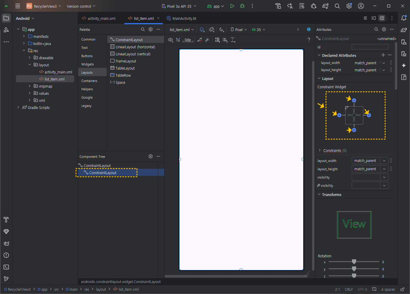 다음, Component Tree창에서 두 번째 ConstraintLayout을 선택하고 오른쪽 Constraints항목에 있는 부분에서 layout_height 만 wrap_content로 바꾸어 주세요.