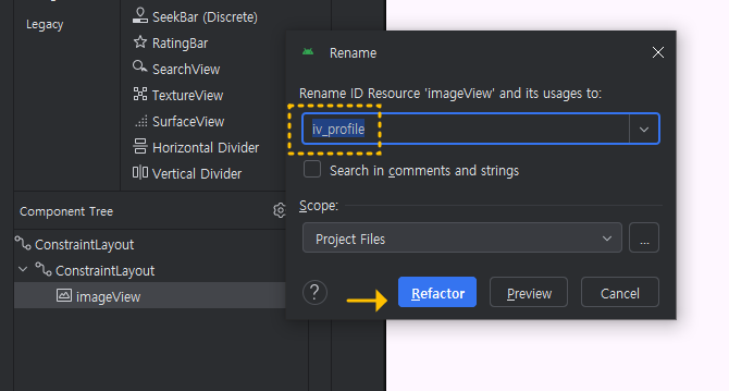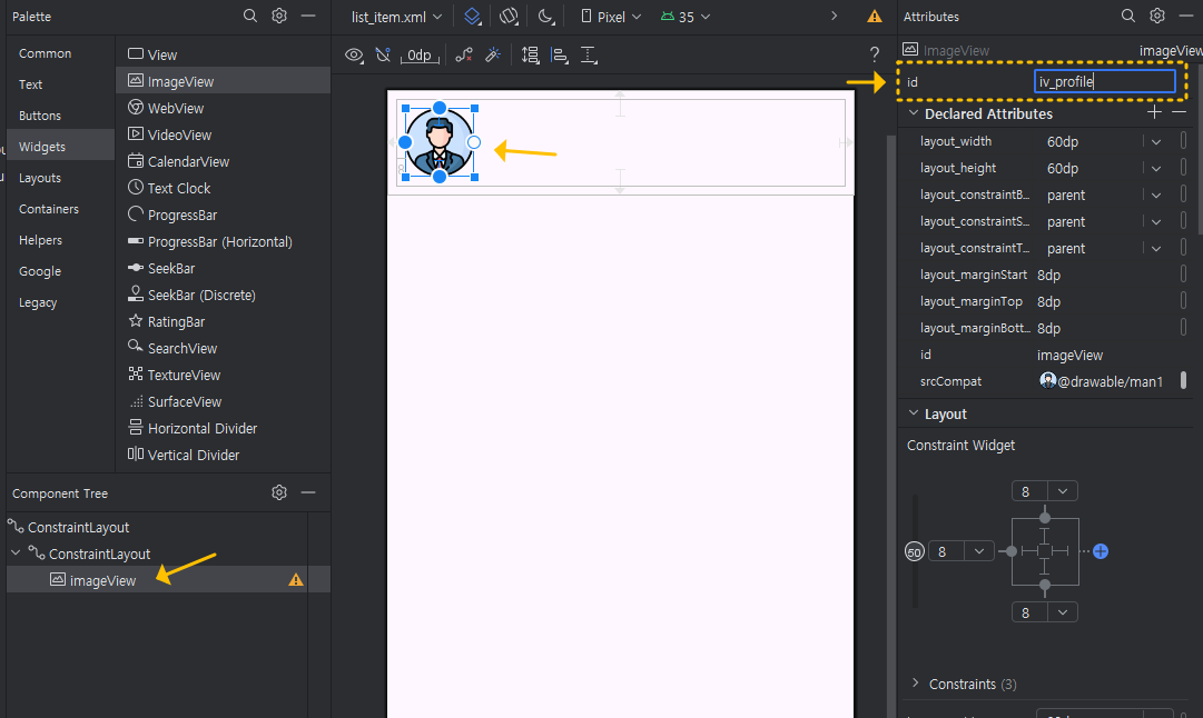 그다음, 이미지를 선택한 상태에서 id를 이미지 뷰를 줄인 약자(iv)로 해서 iv_profile로 설정해 볼게요.