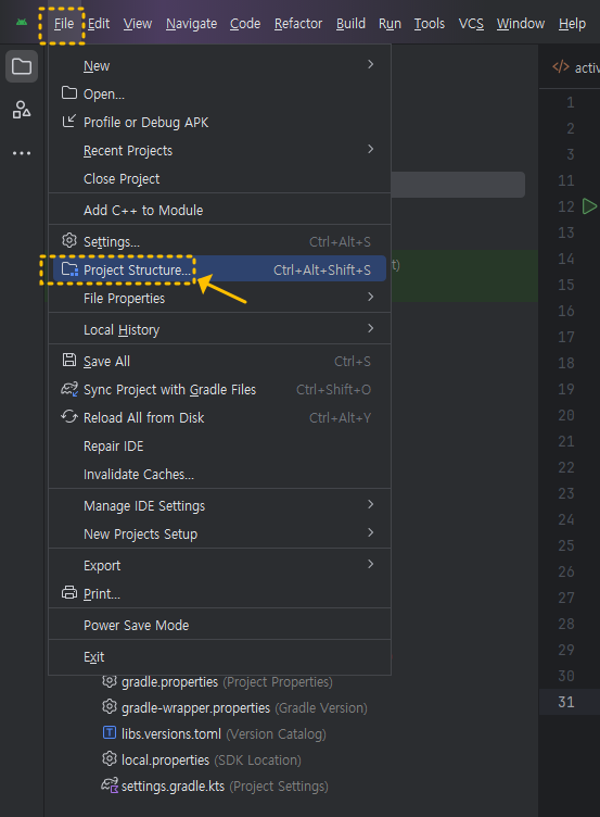 1. File → Project Structure → Modules → Compile Sdk Version을 선택하고 API 35(최신 또는 원하는 버전)으로 적용한 후 안드로이드 스튜디오를 재실행해 주면 해결됩니다.