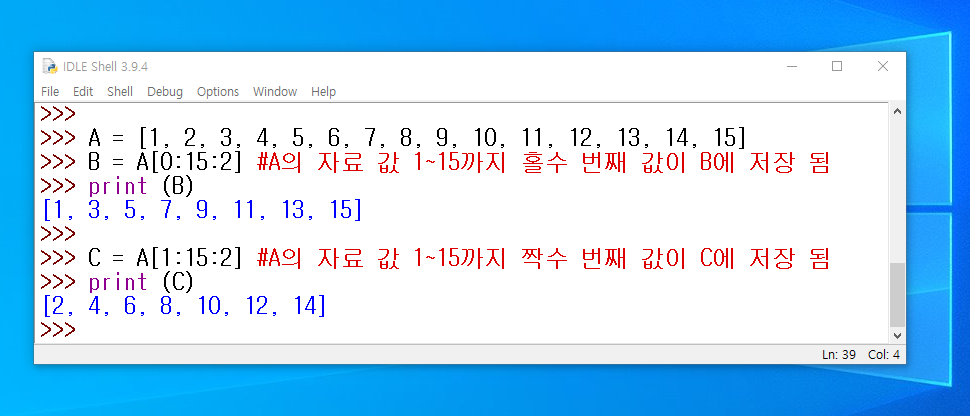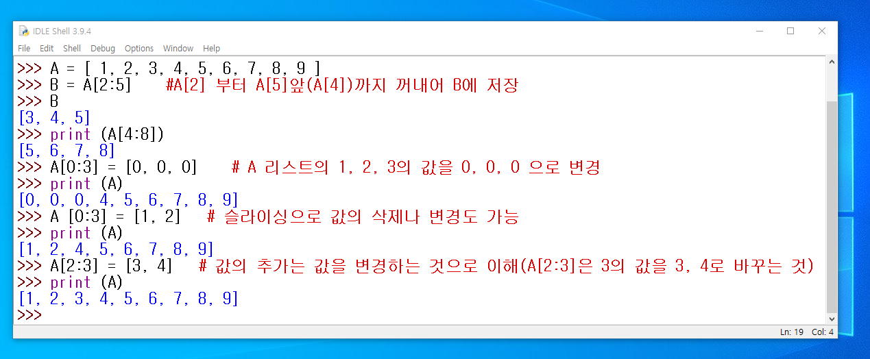 | string [x : y] | x+1번째 문자 부터 y번째 문자까지 | 'abcdefg'의 [2 : 5]요소는 → 'cde' |