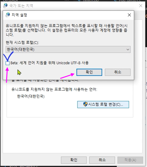 마지막으로, 아래처럼, Beta : 세계 언어 지원을... 부분을 체크하고 확인을 누르세요.