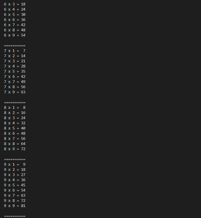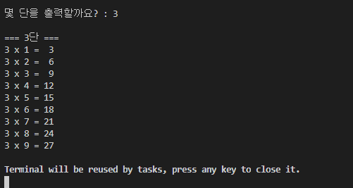 - 알고리즘에 문제가 없으면, '=== 3단 ===' , '줄 바꿈' 등 출력 결과를 꾸며주며 마무리 하세요.